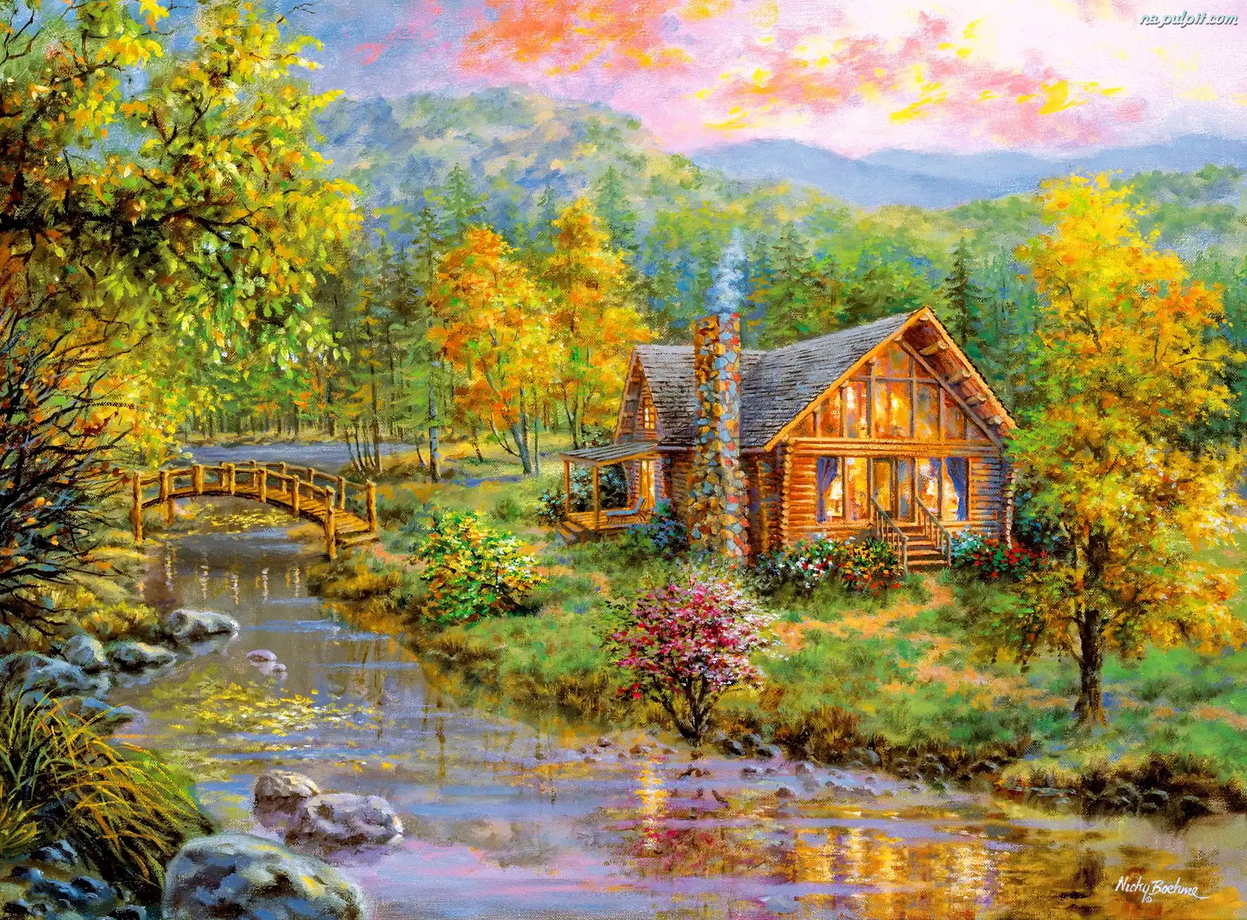 Obraz, Rzeka, Dom, Most