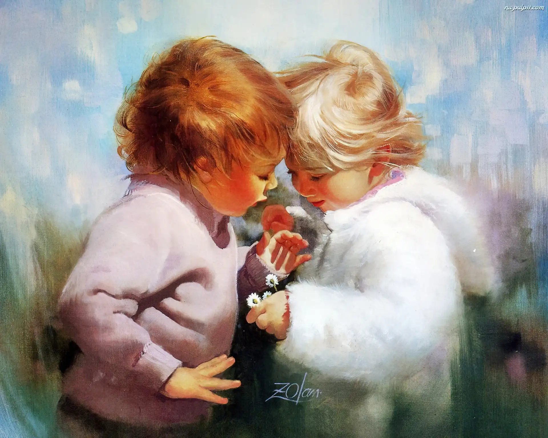 Dwoje, Dzieci, Kwiatuszki, Obraz