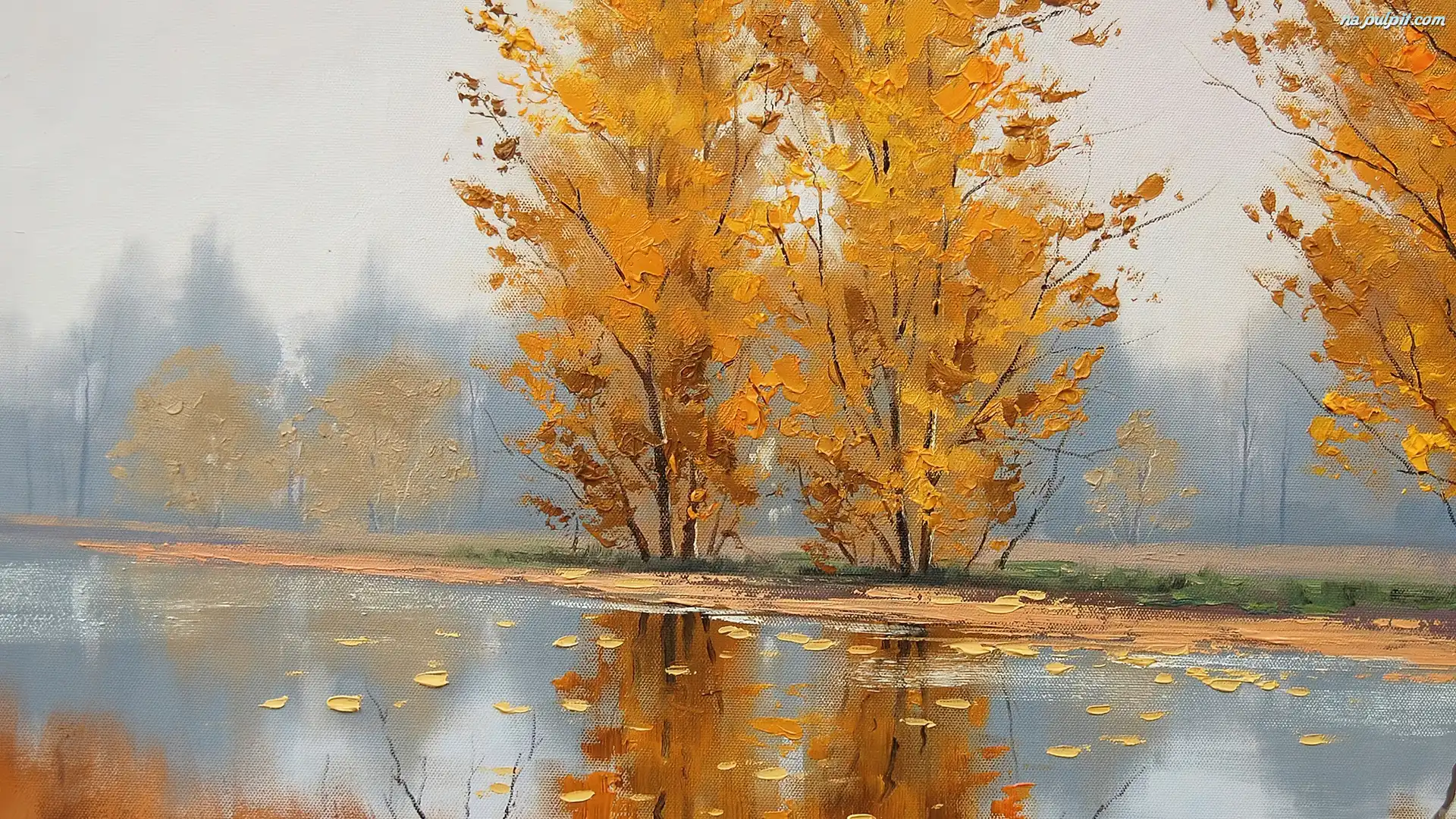 Obraz, Drzewa, Rzeka, Jesień, Farba