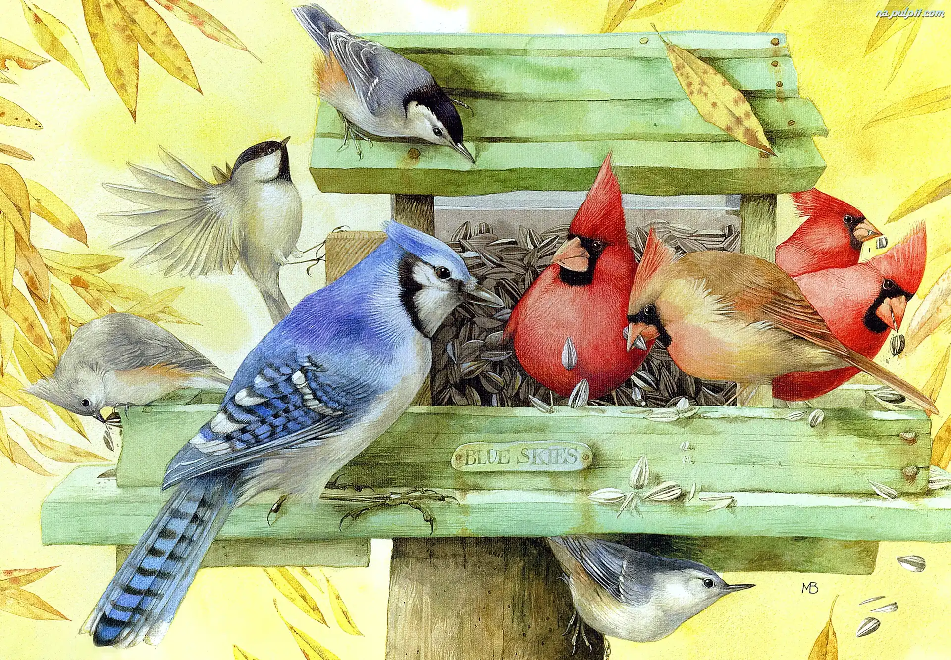 Kardynały, Zielony, Domek, Sójka, Ptaki, Sikorki Na Pulpit