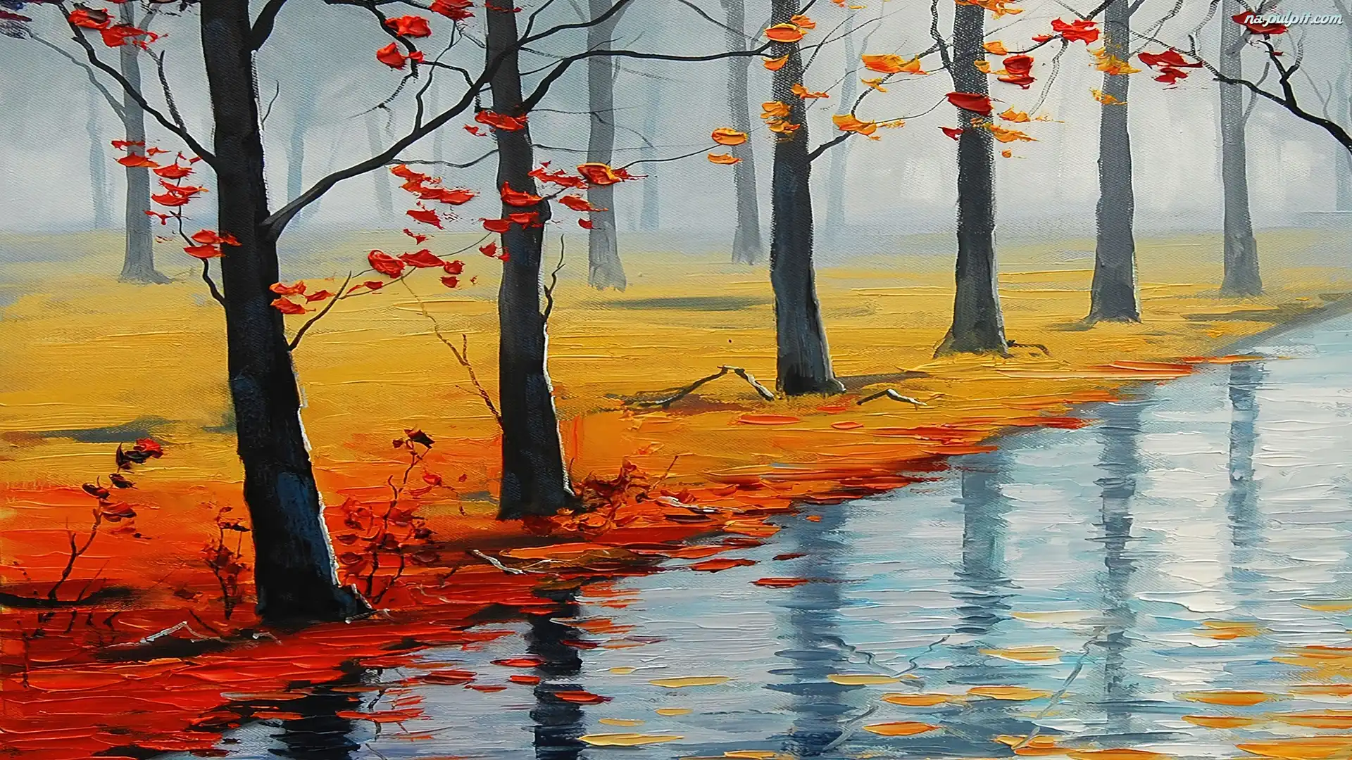 Obraz, Liście, Drzewa, Rzeka, Jesień