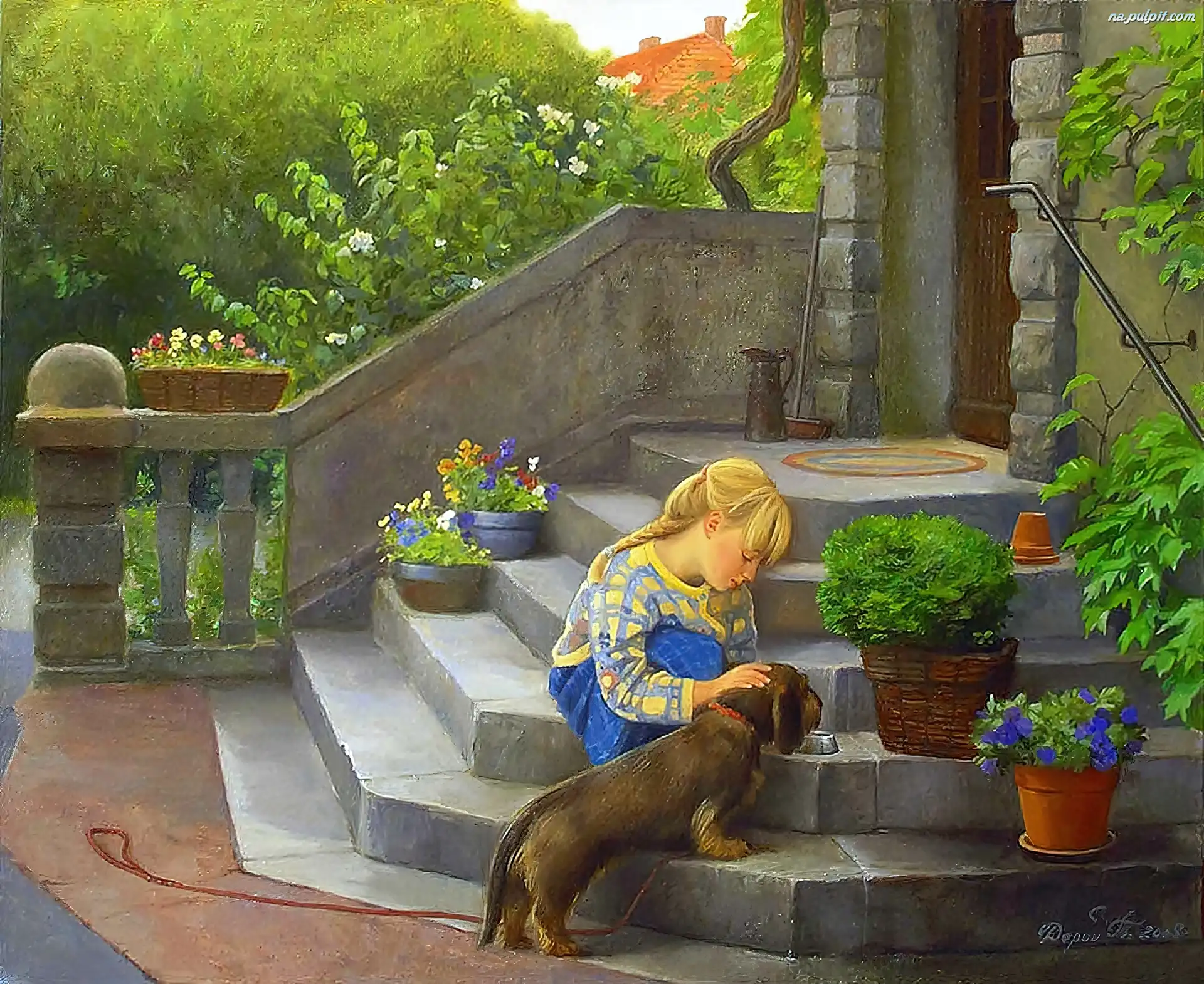 Obrazu, Schody, Pies, Dziewczynka, Reprodukcja Na Pulpit