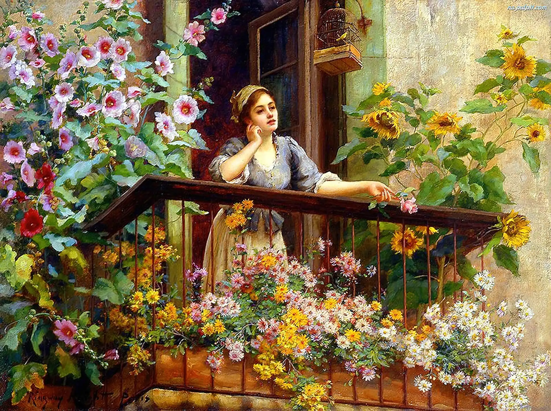 Obrazu, Balkon, Kwiaty, Kobieta, Reprodukcja Na Pulpit