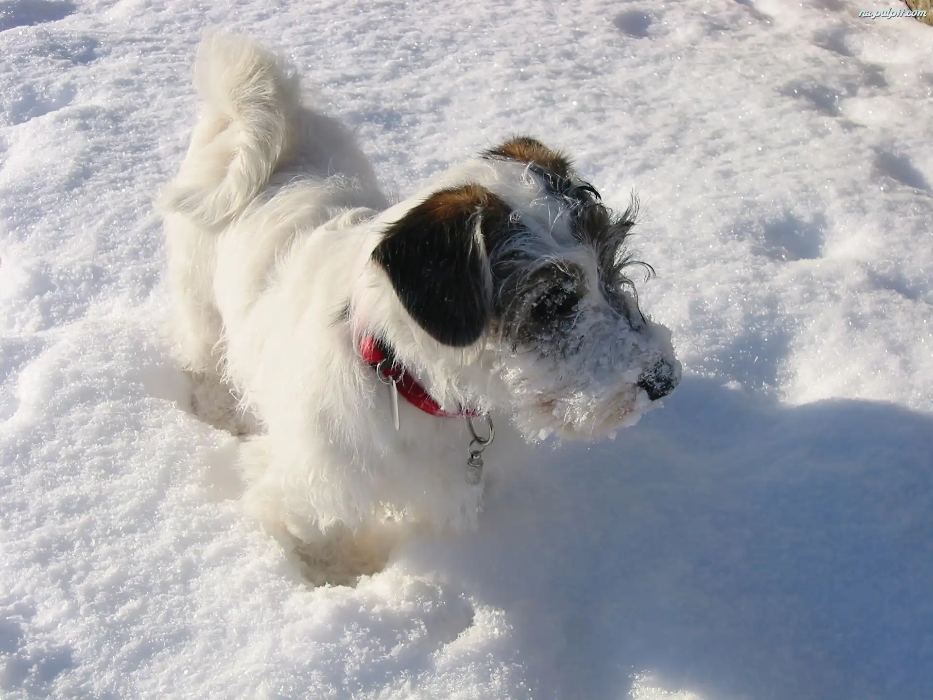 obroża, śnieg, Sealyham Terrier, czerwona Na Pulpit