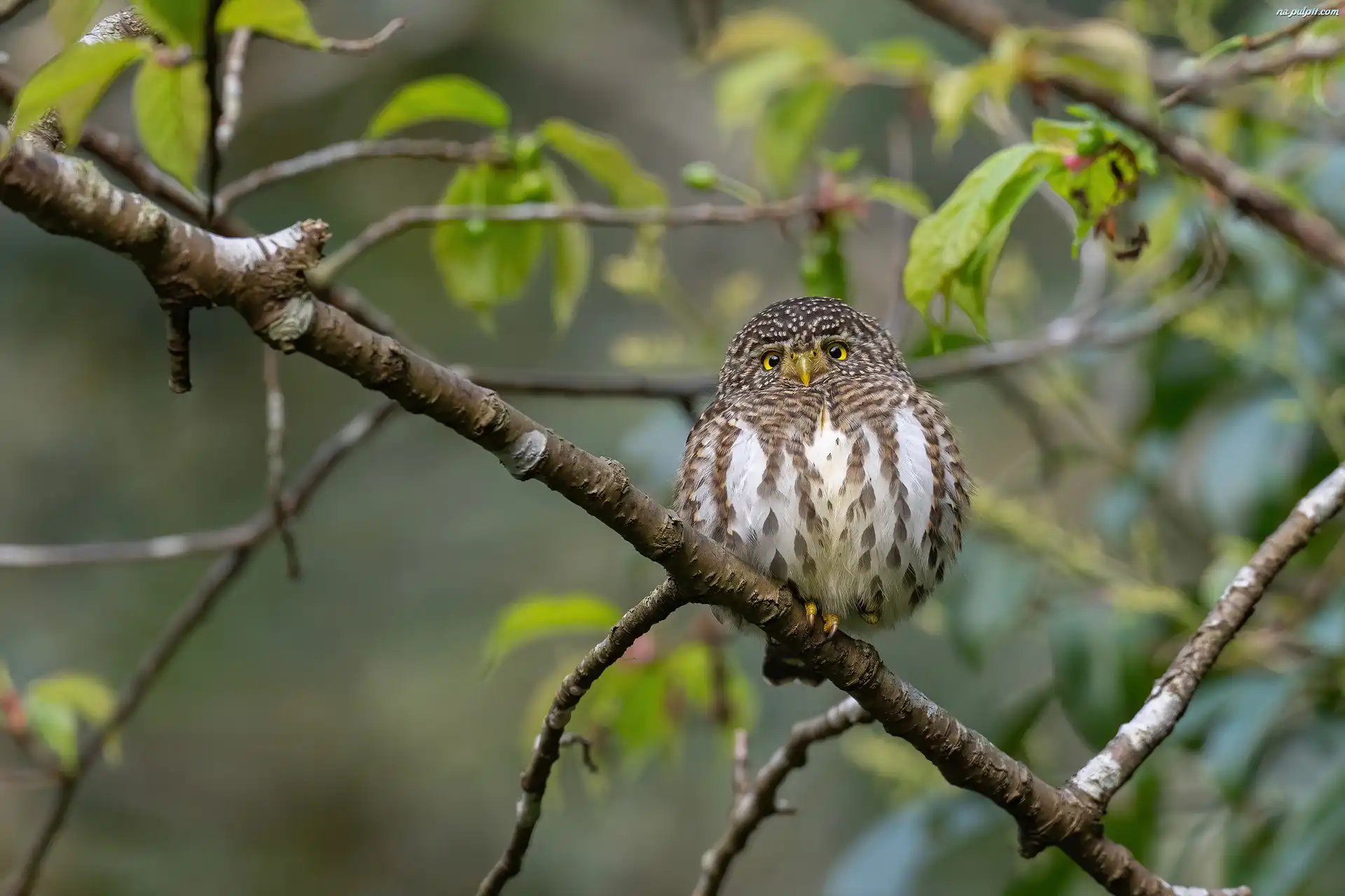 Liście, Ptak, Sóweczka obrożna, Gałęzie, Sowa, Zbliżenie Na Pulpit