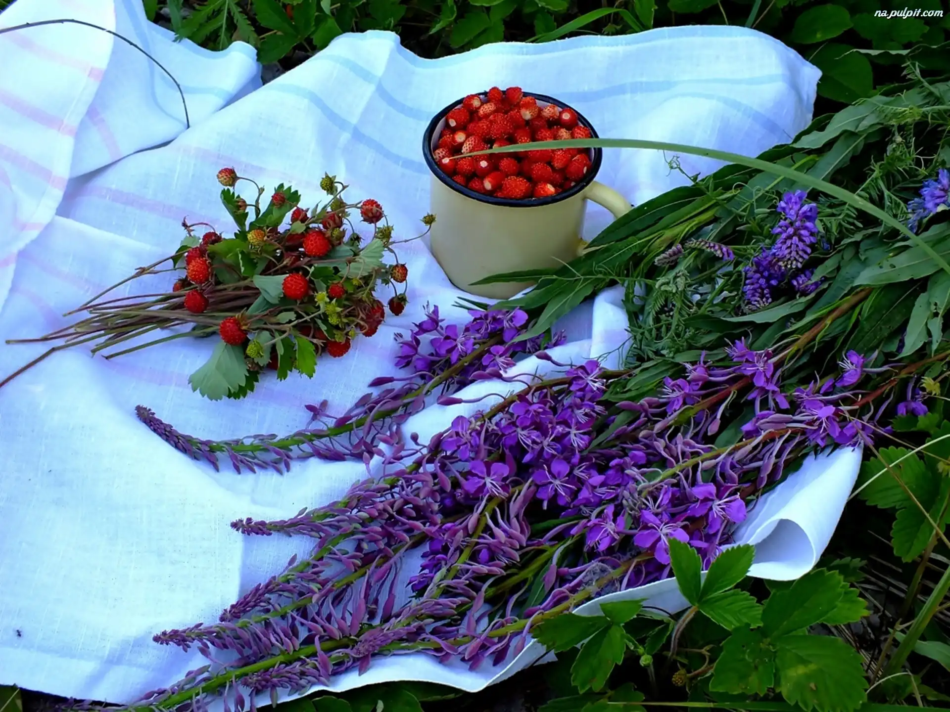 Obrus, Kwiaty, Poziomki, Kubek Na Pulpit