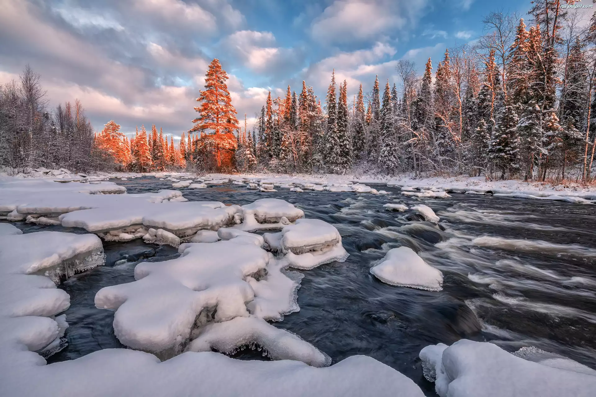 Drzewa, Zachód Słońca, Obwód Murmański, Rzeka Kola, Lód, Półwysep Kolski, Rosja, Zima, Śnieg Na Pulpit |
