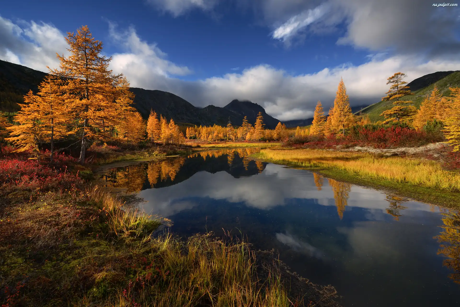 Kołyma, Rzeka, Potok Nieznany, Drzewa, Obwód magadański, Rosja, Jesień, Góry Kołymskie, Chmury Na Pulpit |