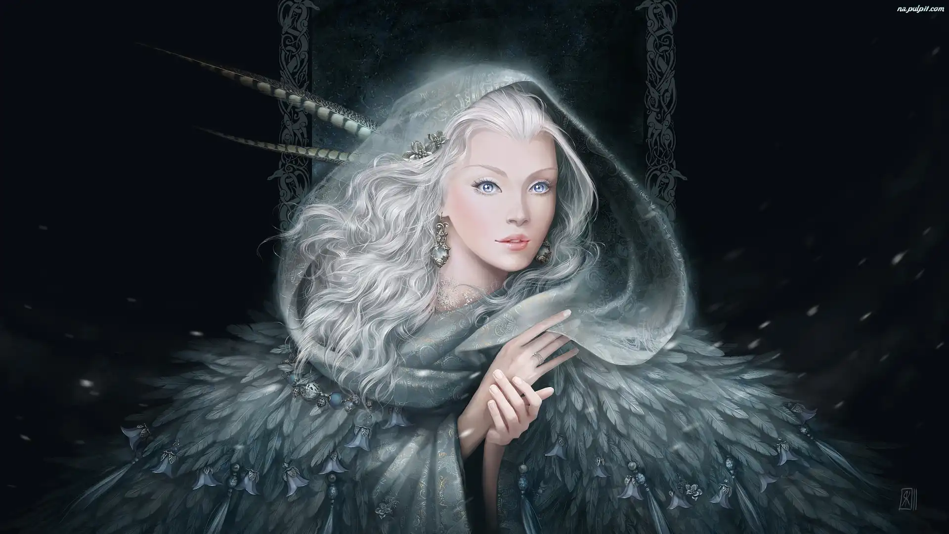 Kaptur, Dziewczyna, Białe, Włosy, Peleryna, Pióra, Niebieskie, Grafika, Oczy Na Pulpit