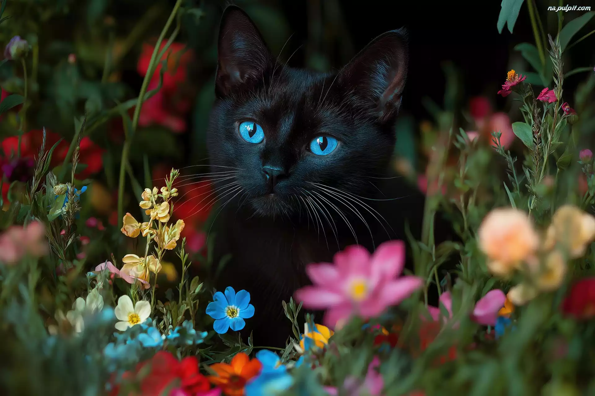 Kwiaty, Czarny, Niebieskie, Oczy, Kot, Grafika Na Pulpit