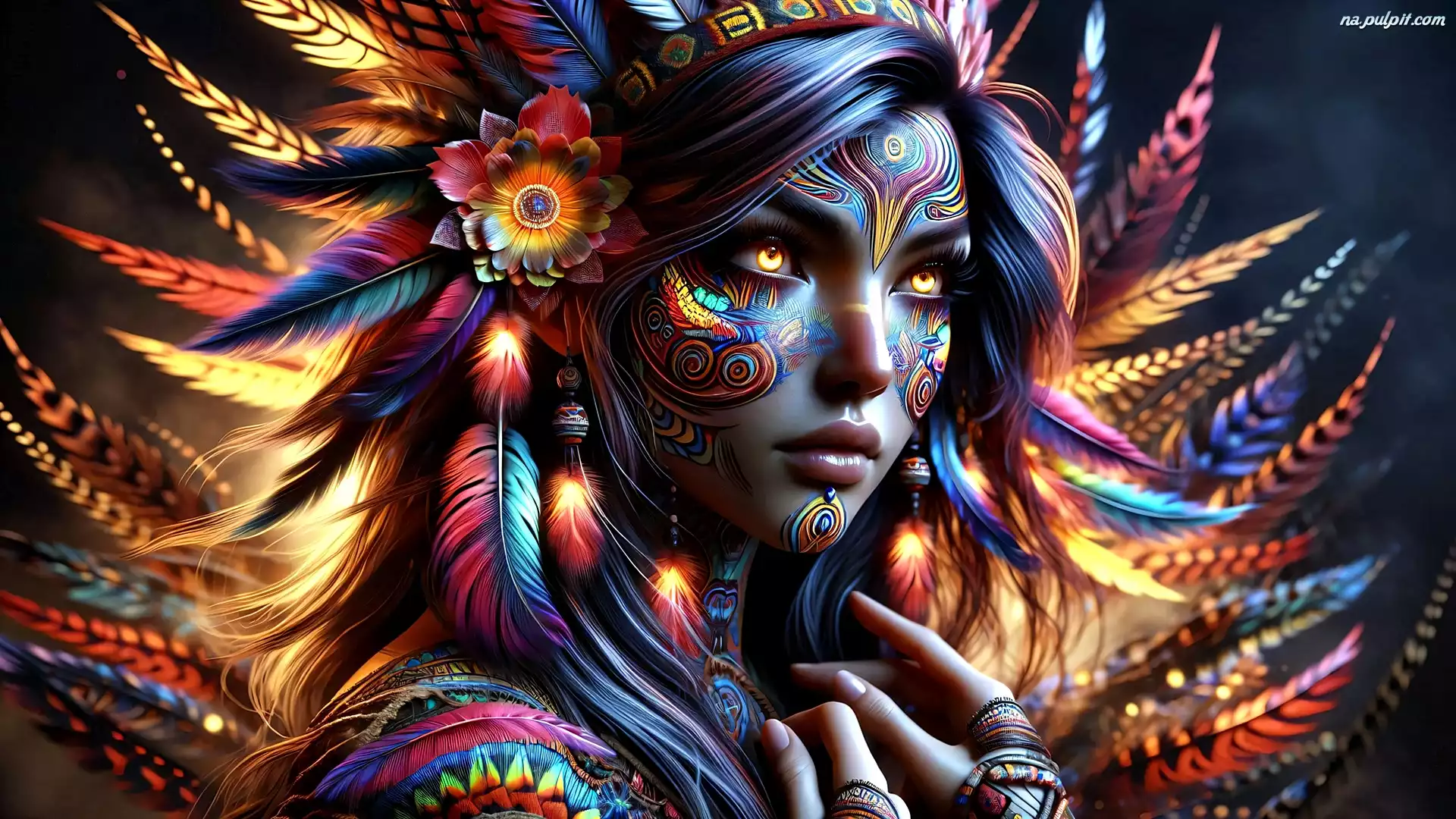 Tatuaż, Kobieta, Żółte, Oczy, Pióra, Grafika Na Pulpit