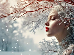 Gałązki, Kobieta, Zamknięte, Oczy, Twarz, Śnieg