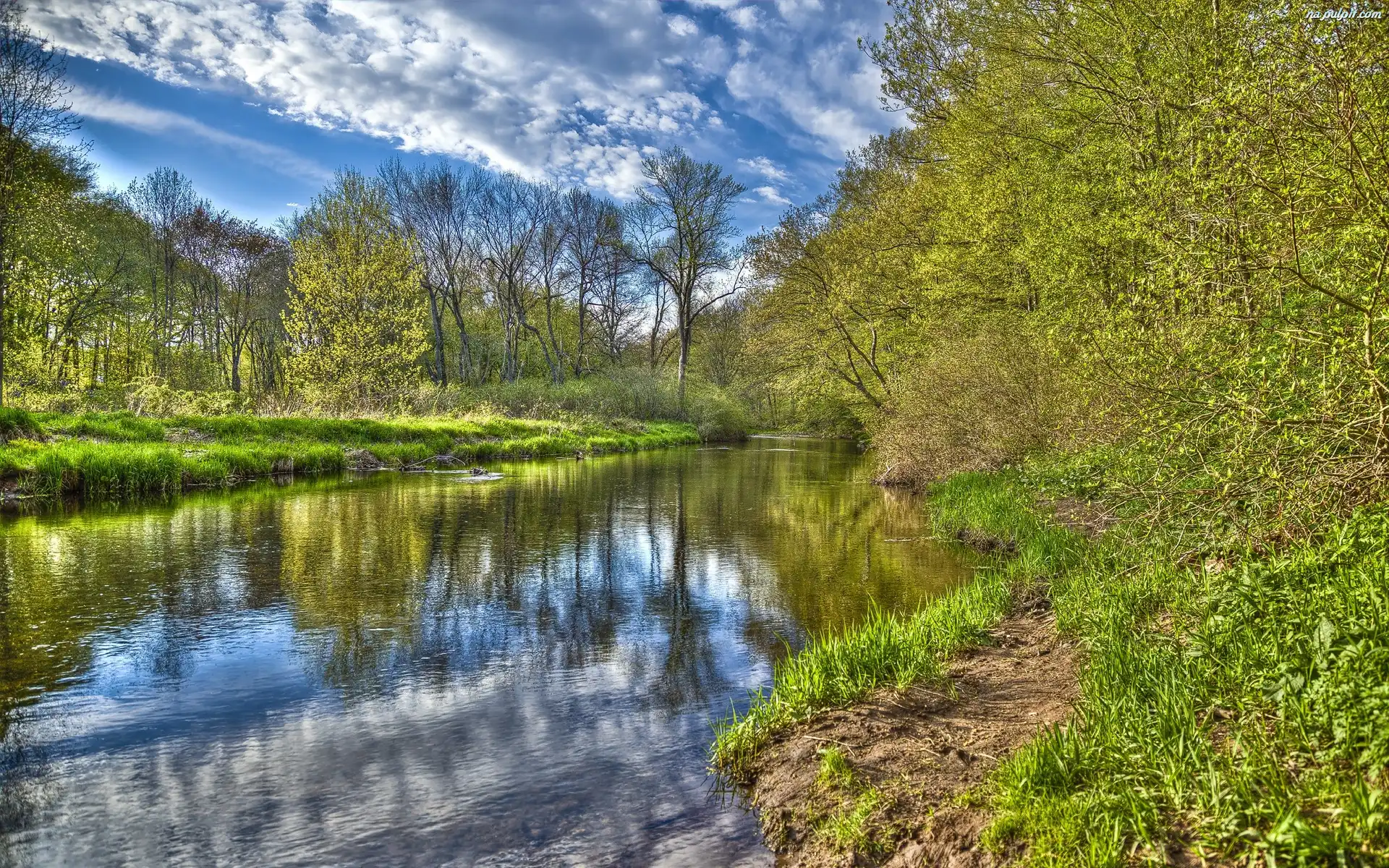 Odbicie, Drzewa, Rzeka, Brzegi, Chmury Na Pulpit