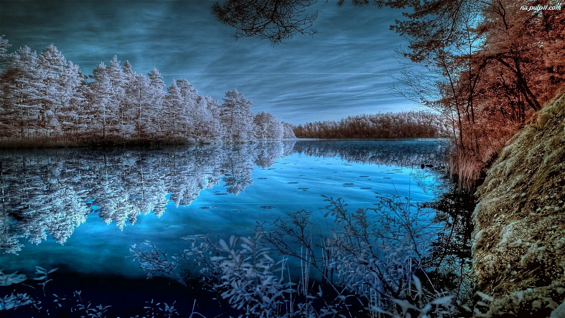 Odbicie, Drzewa, Chmury, Jezioro Na Pulpit