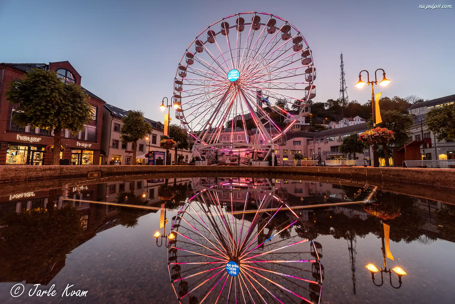 Okręg Agder, Koło, Norwegia, Wieczór, Kanał, Odbicie, Domy, Widokowe, Latarnie, Arendal