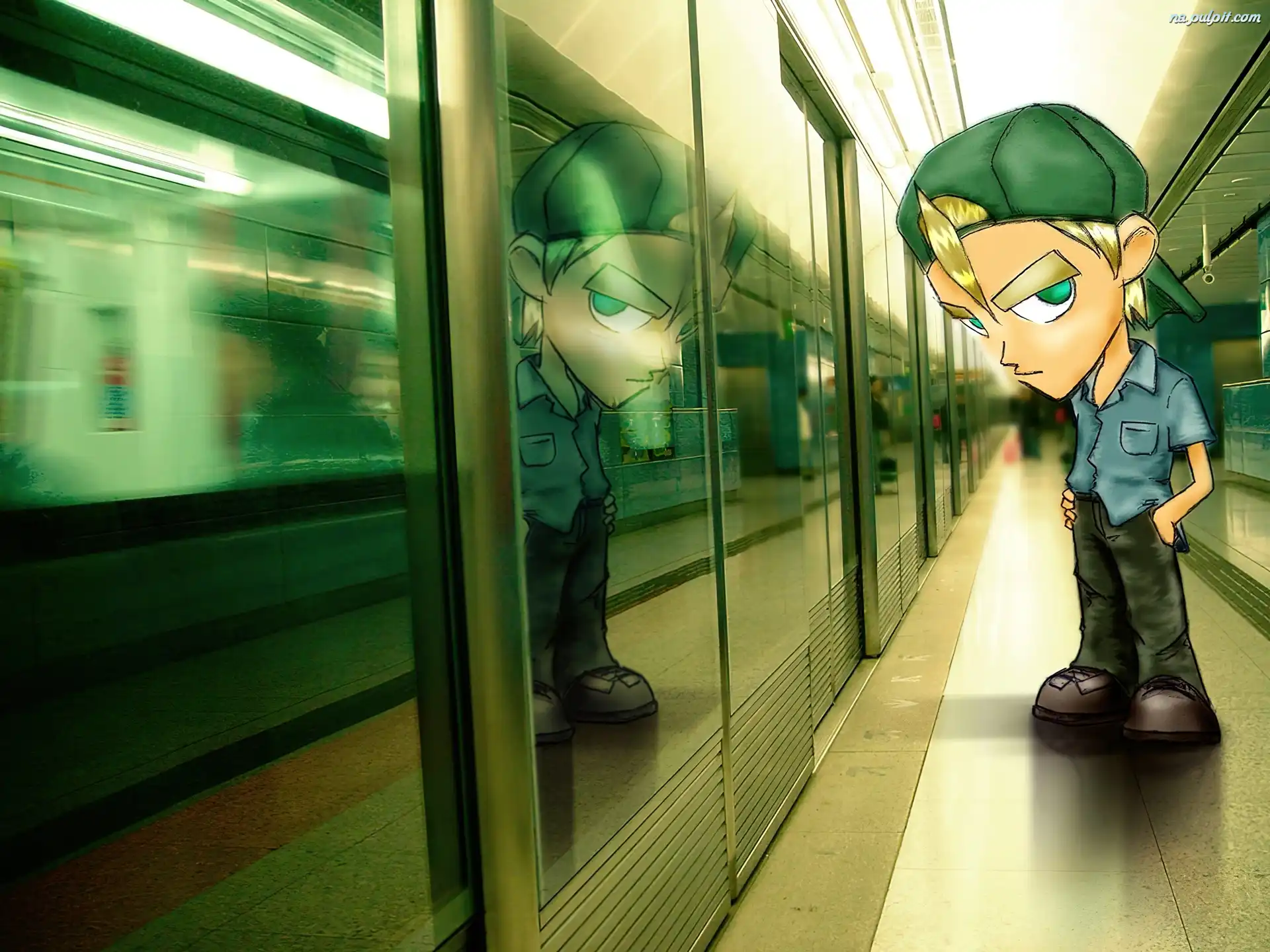 odbicie, zielona, postać, grafika, czapka Na Pulpit