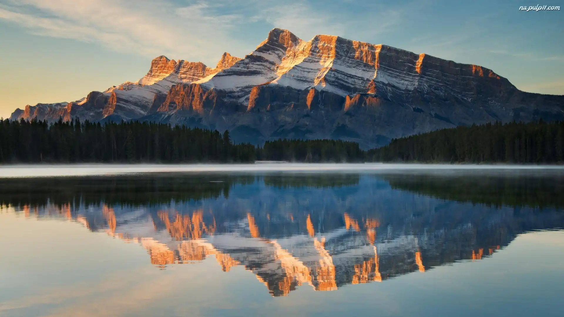 Odbicie, Prowincja Alberta, Park Narodowy Banff, Las, Mgła, Góra Mount Rundle, Kanada, Jezioro Two Jack Lake Na Pulpit |