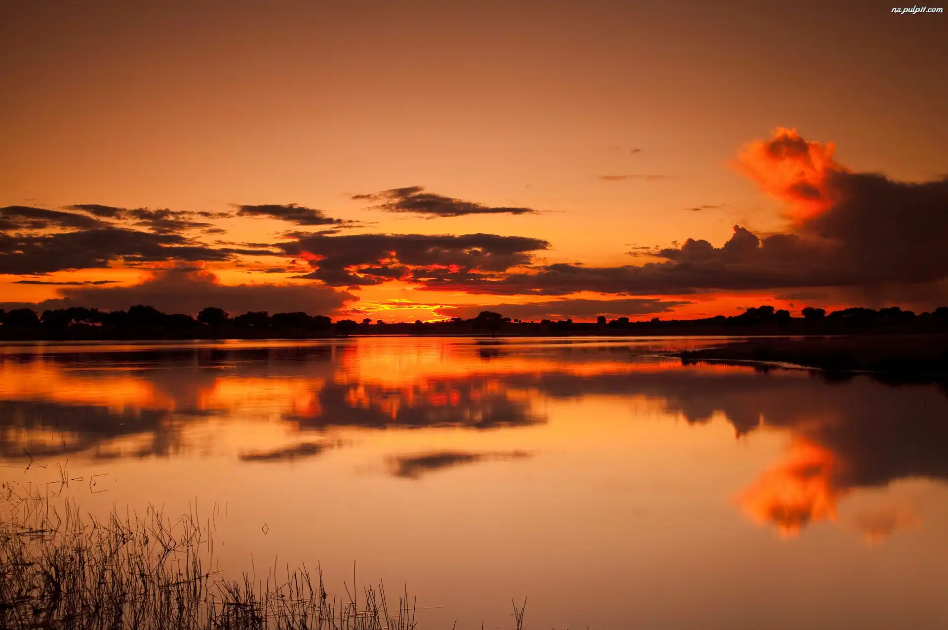 Odbicie, Zachód, Chmury, Jezioro, Słońca