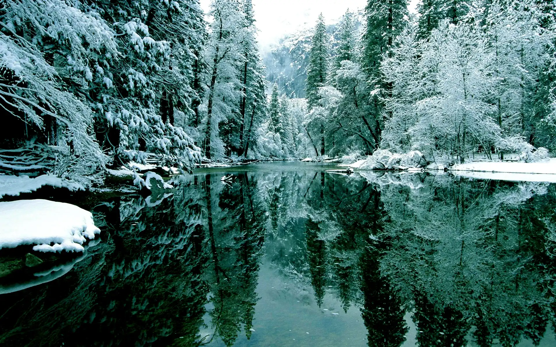 Odbicie, Drzewa, Jezioro, Åšnieg Na Pulpit