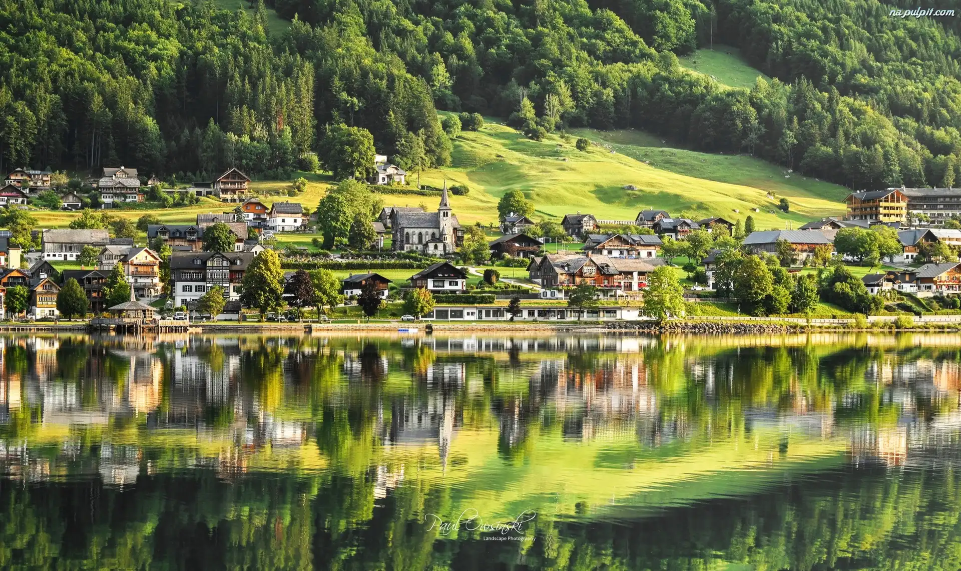 Jezioro, Domy, Las, Odbicie Na Pulpit