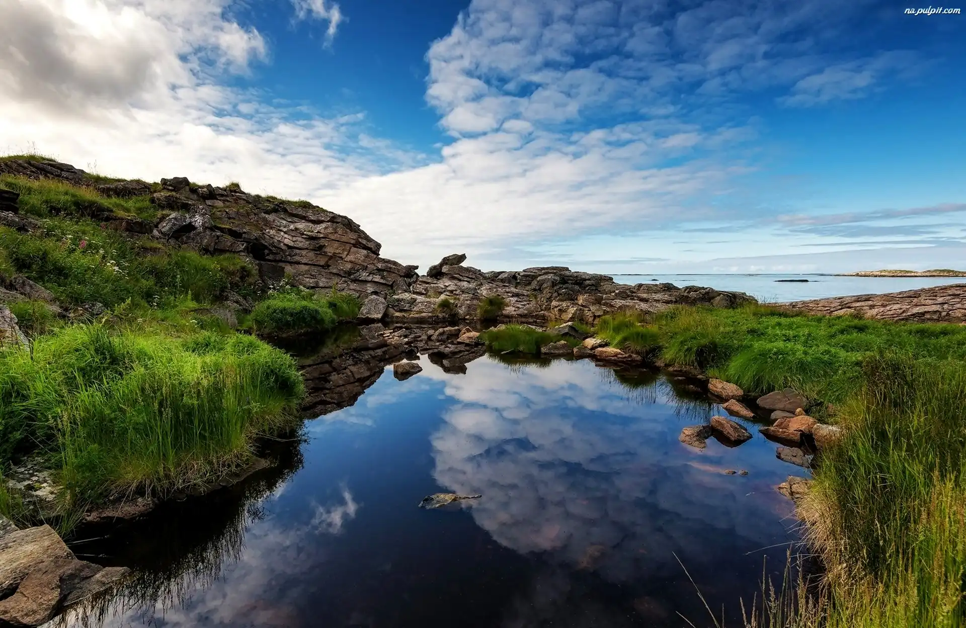 Odbicie, Skały, Jezioro, Chmury Na Pulpit