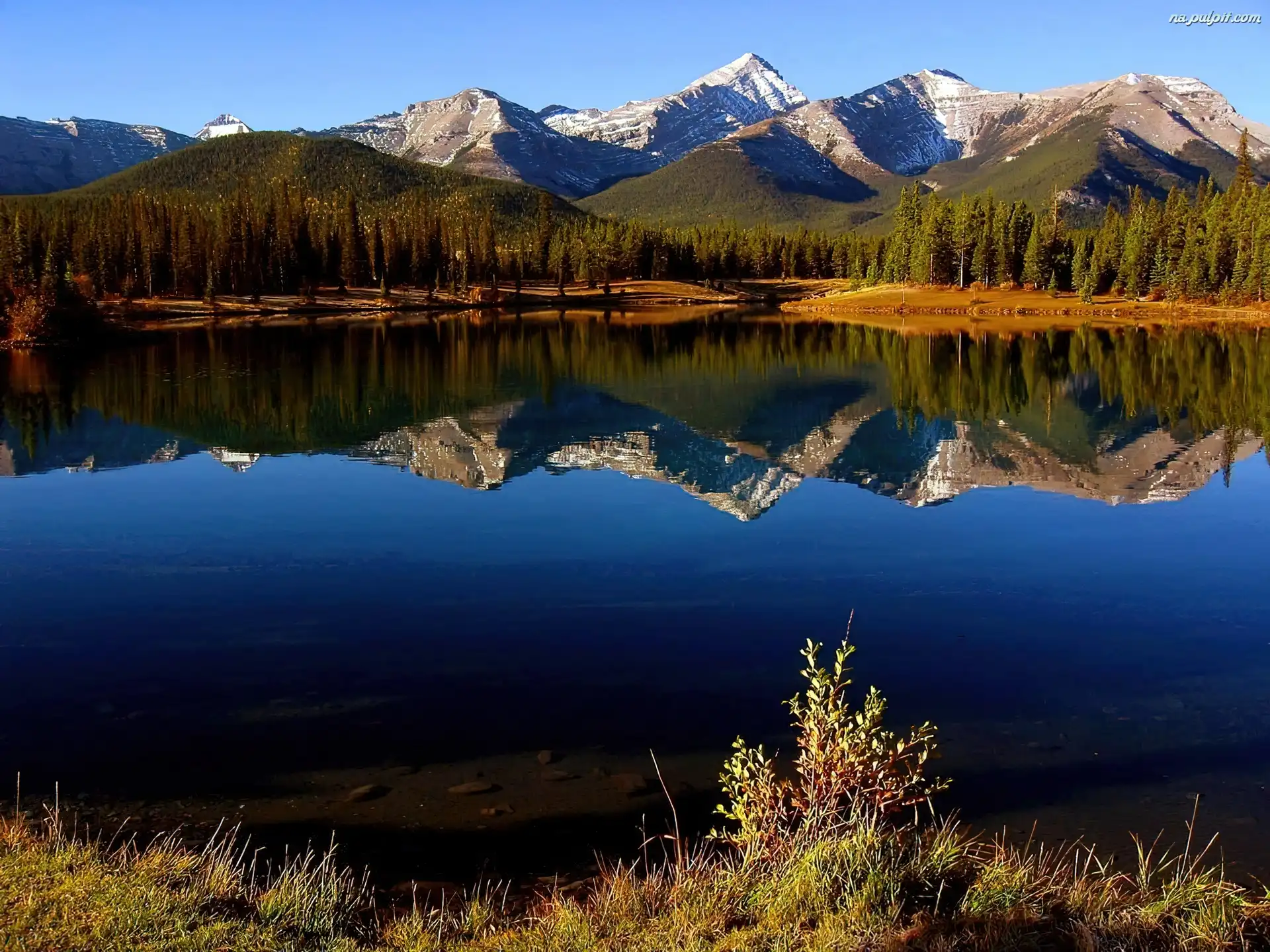 Odbicie, Drzewa, Trawa, Jezioro, Góry