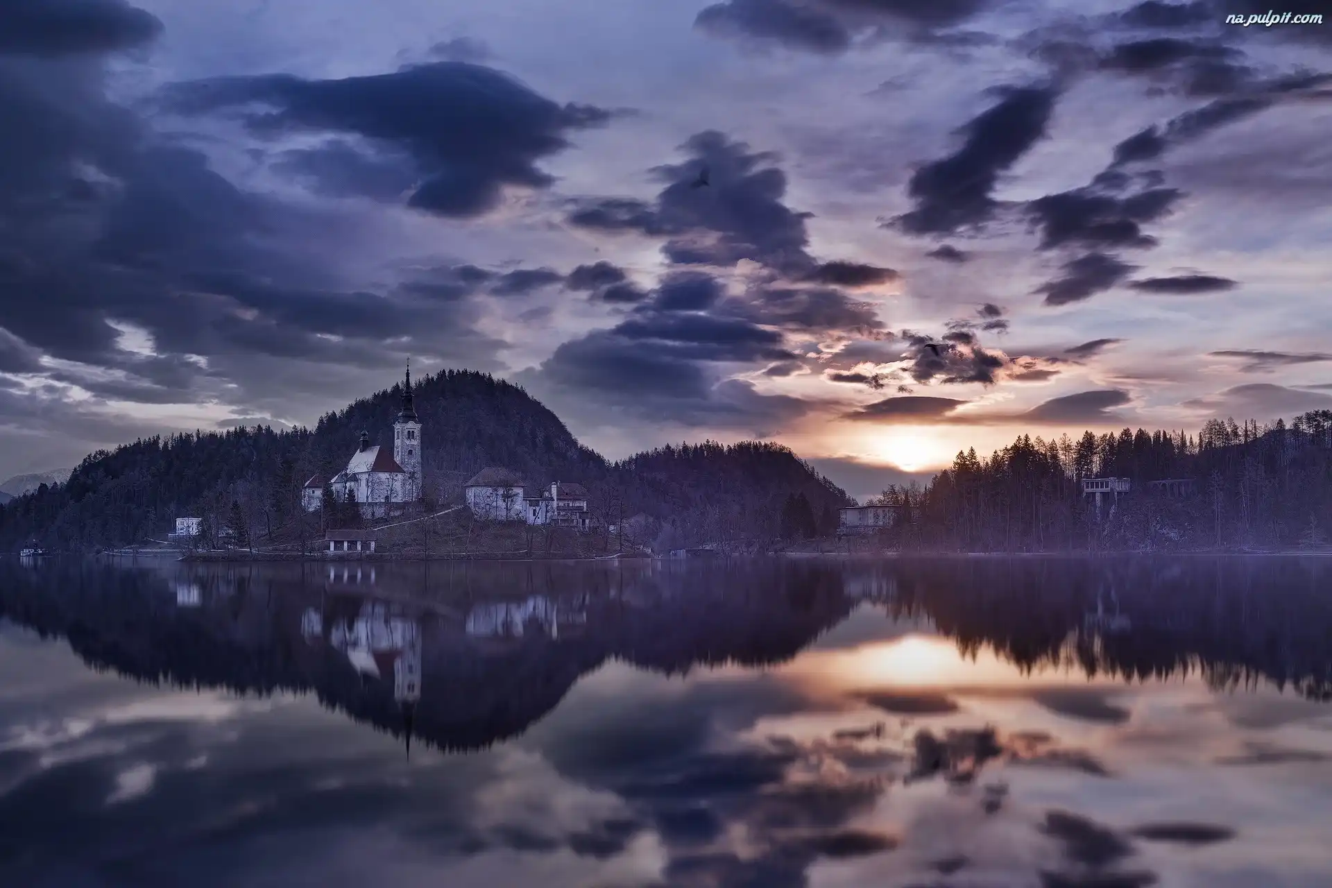 Odbicie, Chmury, Kościół, Jezioro Na Pulpit