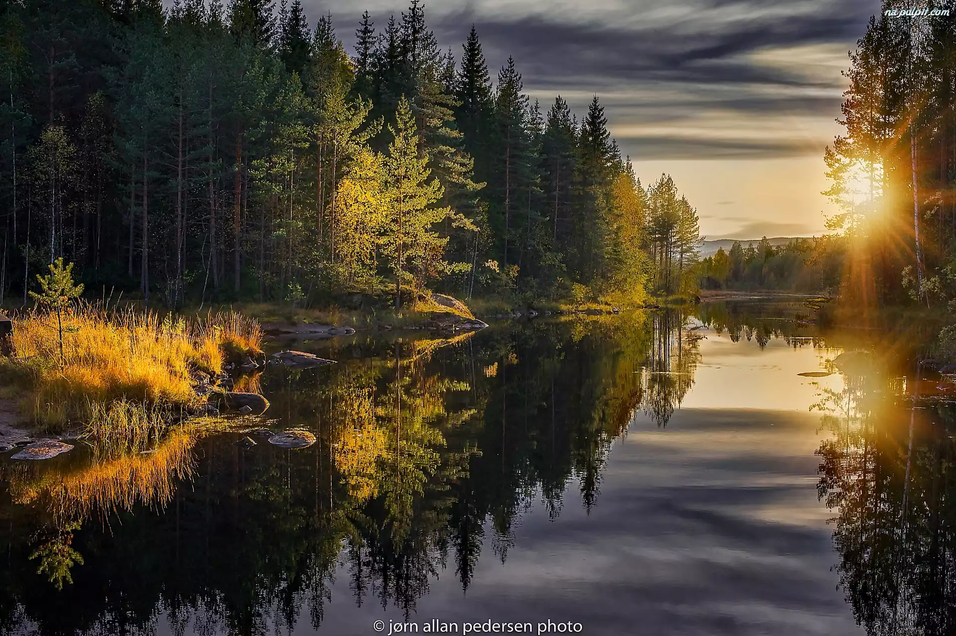 Odbicie, Wschód słońca, Jesień, Las, Rzeka Na Pulpit
