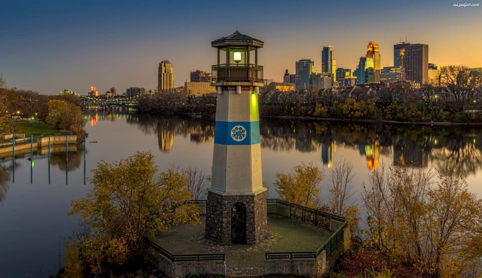 Odbicie, Miasto, Woda, Latarnia, Drzewa Na Pulpit