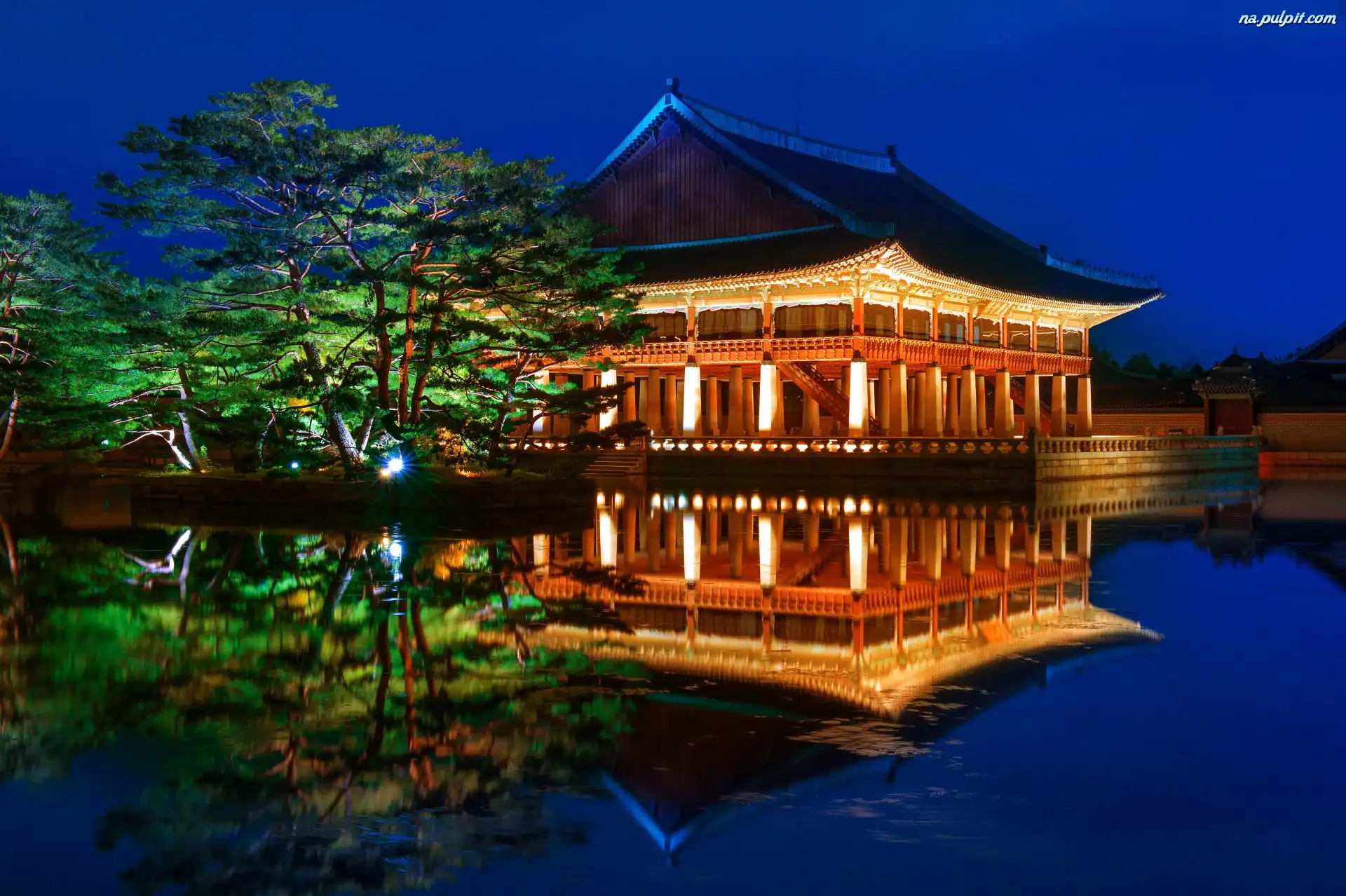 Korea Południowa, Noc, Seul, Staw, Drzewa, Pałac Gyeongbokgung, Odbicie Na Pulpit