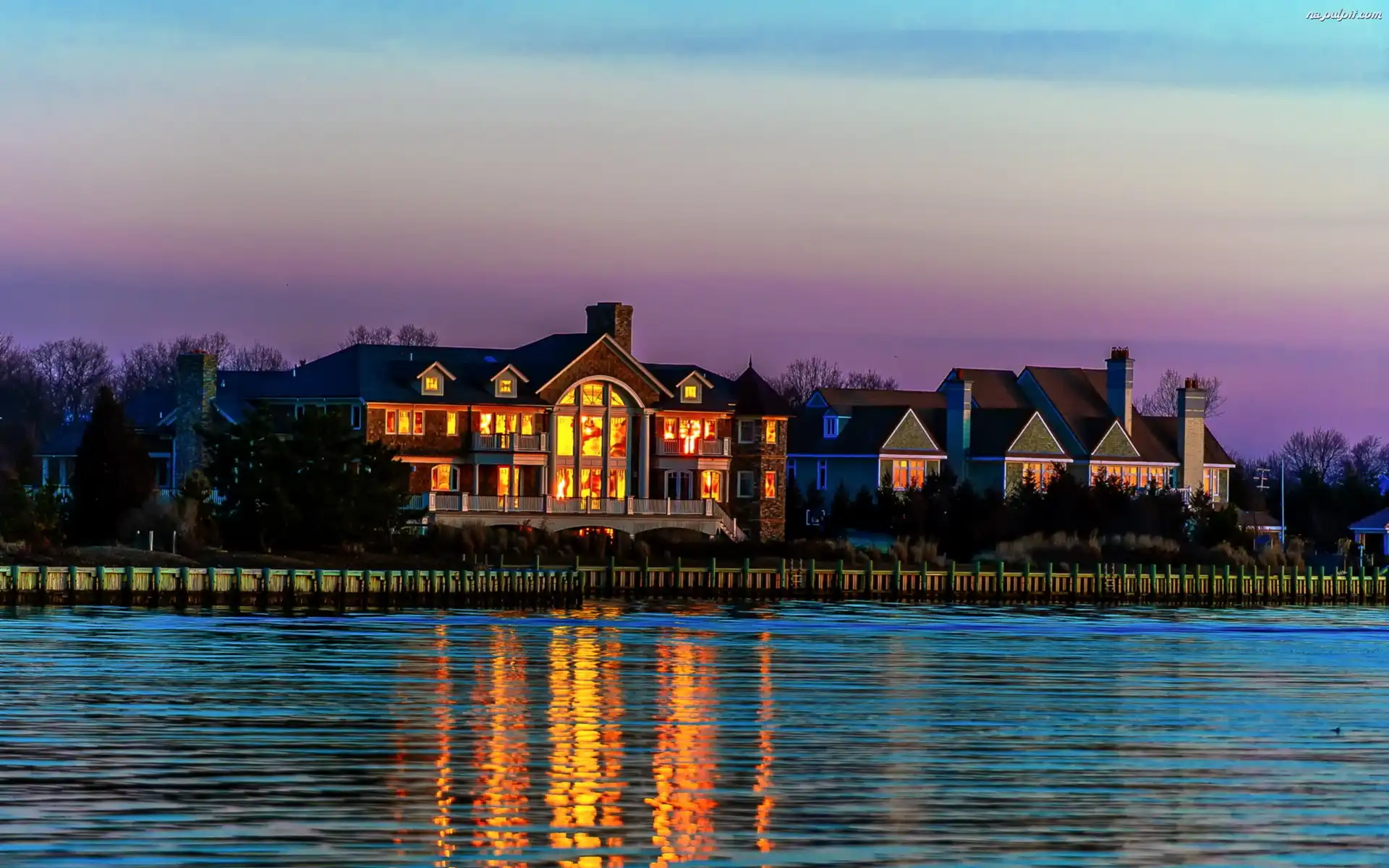 Odbicie, Dom, Oświetlony, Rzeka Na Pulpit