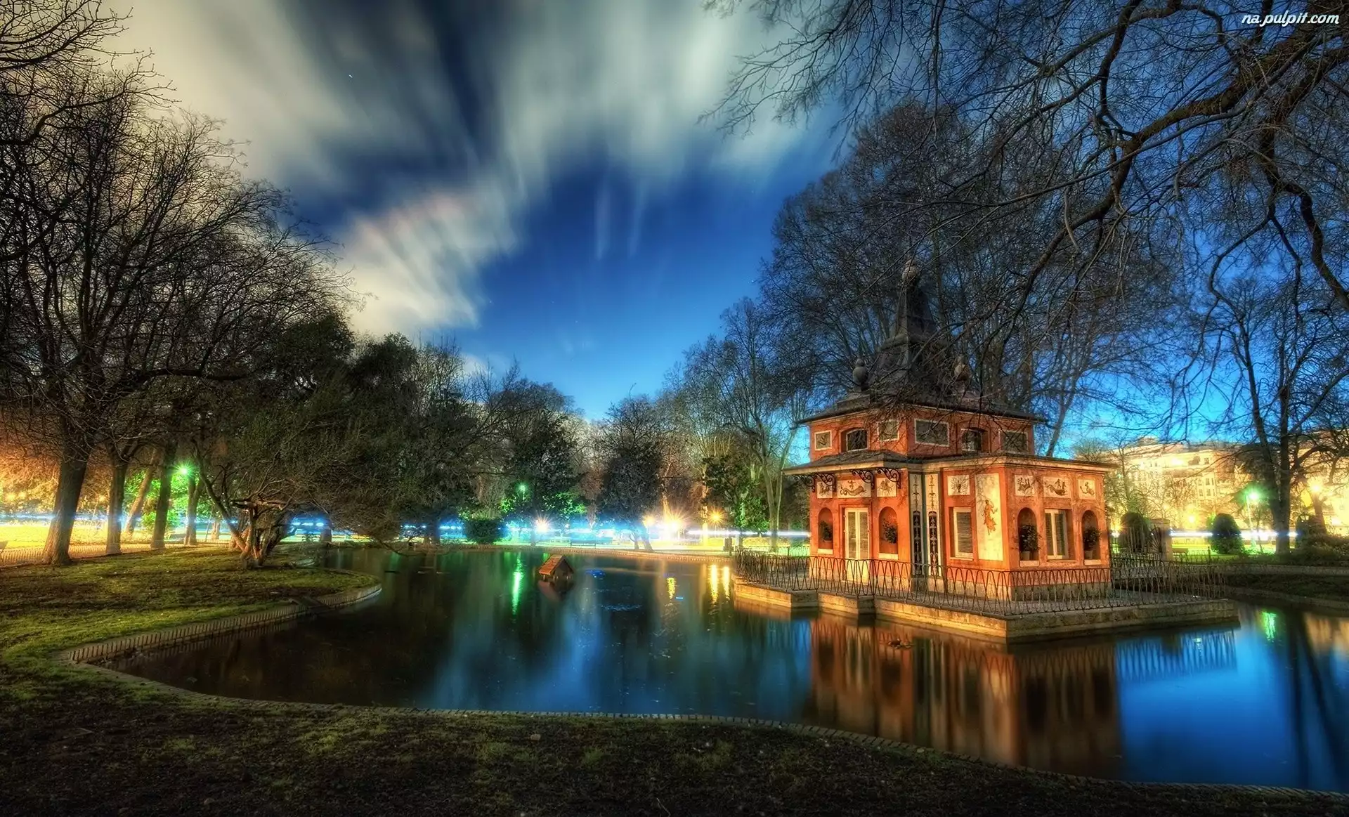 Odbicie, Drzewa, Jeziorko, Park, Domek Na Pulpit