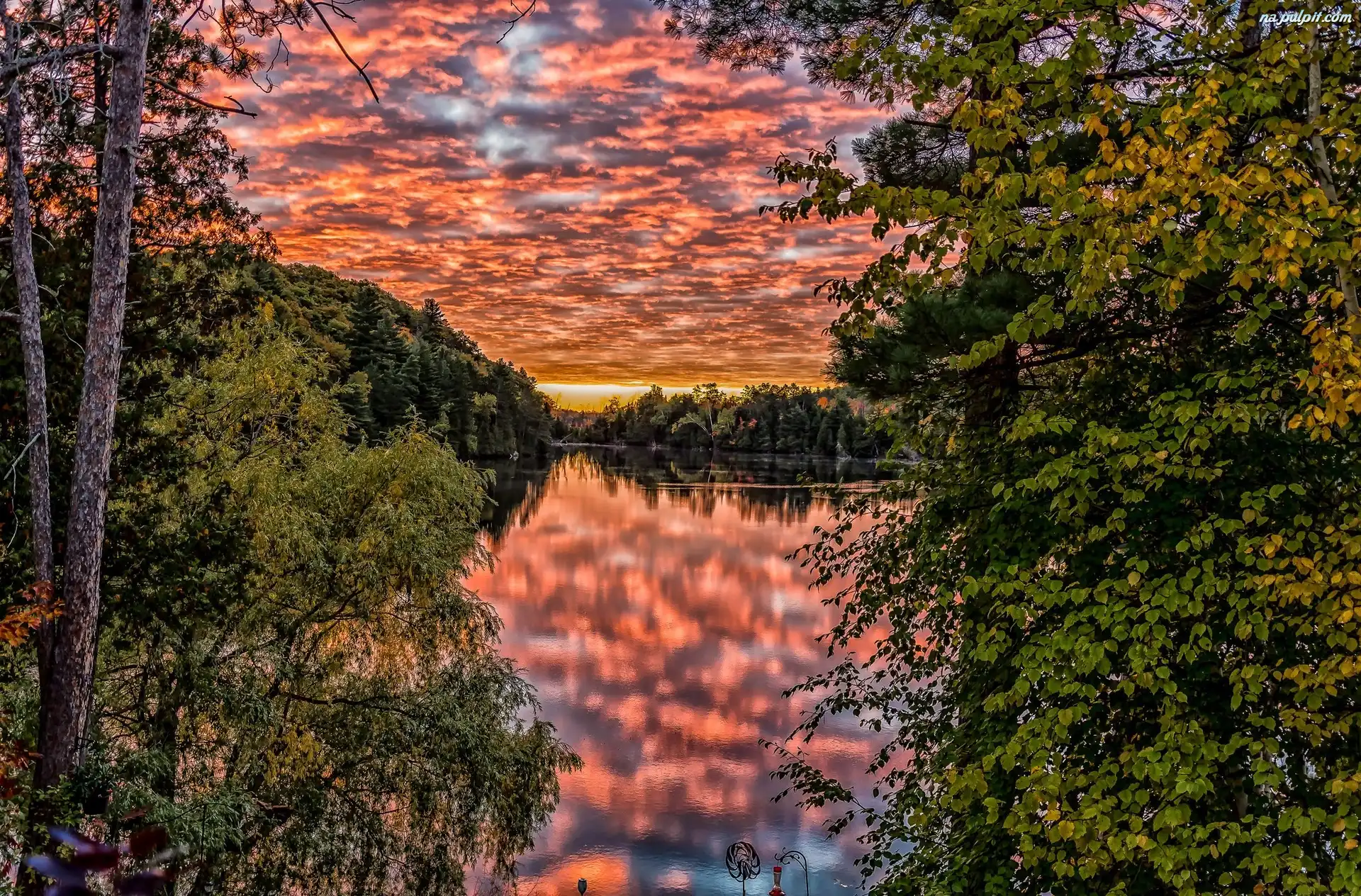 Odbicie, Czerwone, Drzewa, Rzeka, Niebo
