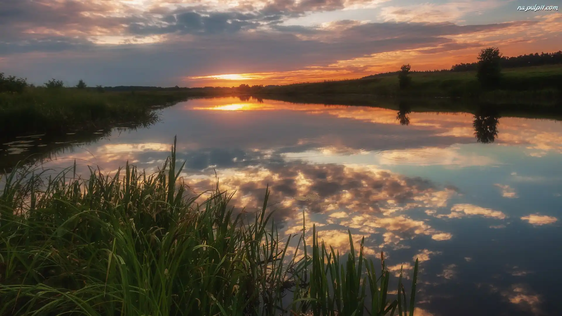 Odbicie, Trawy, Zachód słońca, Rzeka, Chmury Na Pulpit