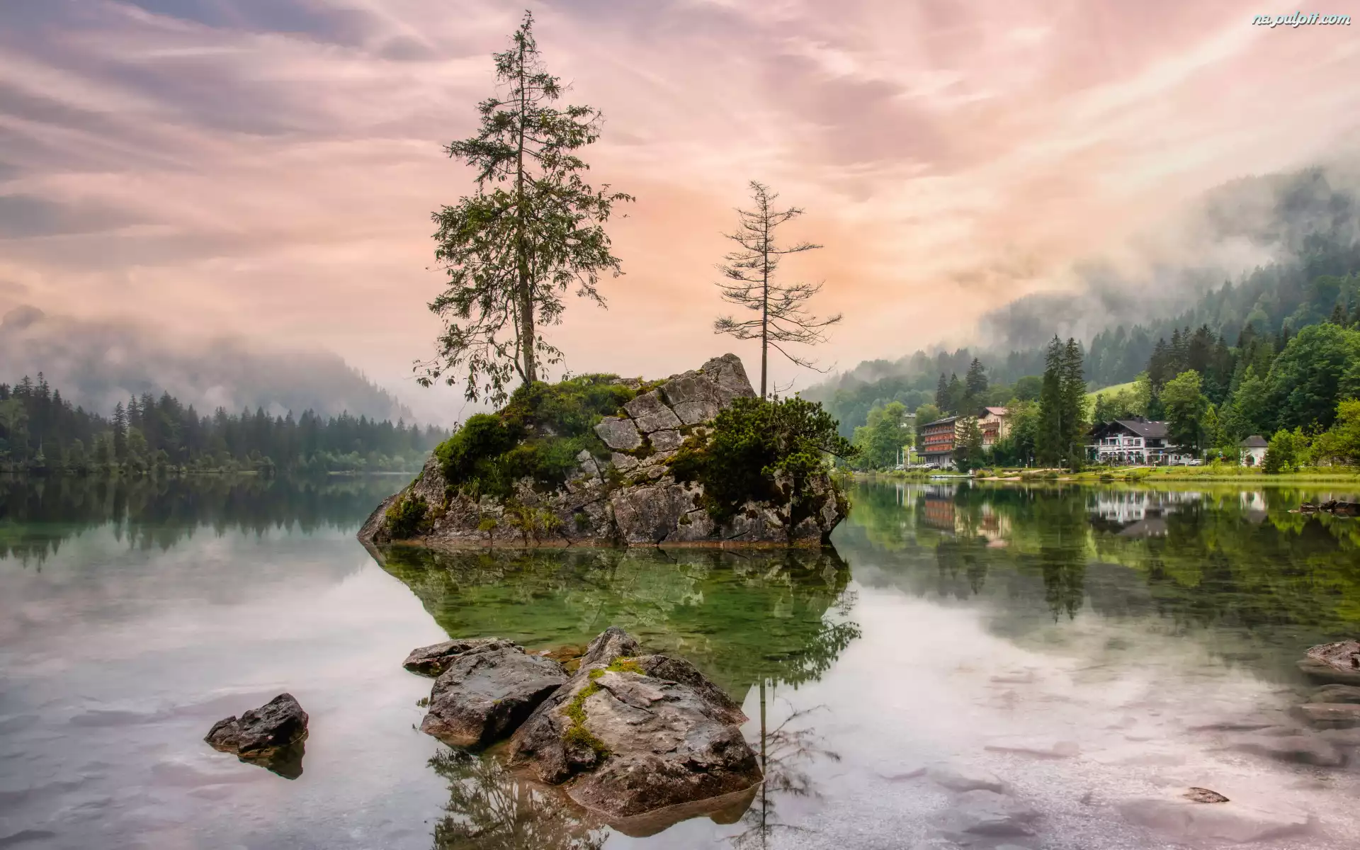 Alpy, Bawaria, Góry, Poranek, Skała, Domy, Mgła, Niemcy, Odbicie, Brzeg, Drzewa, Jezioro Hintersee, Kamienie Na Pulpit |