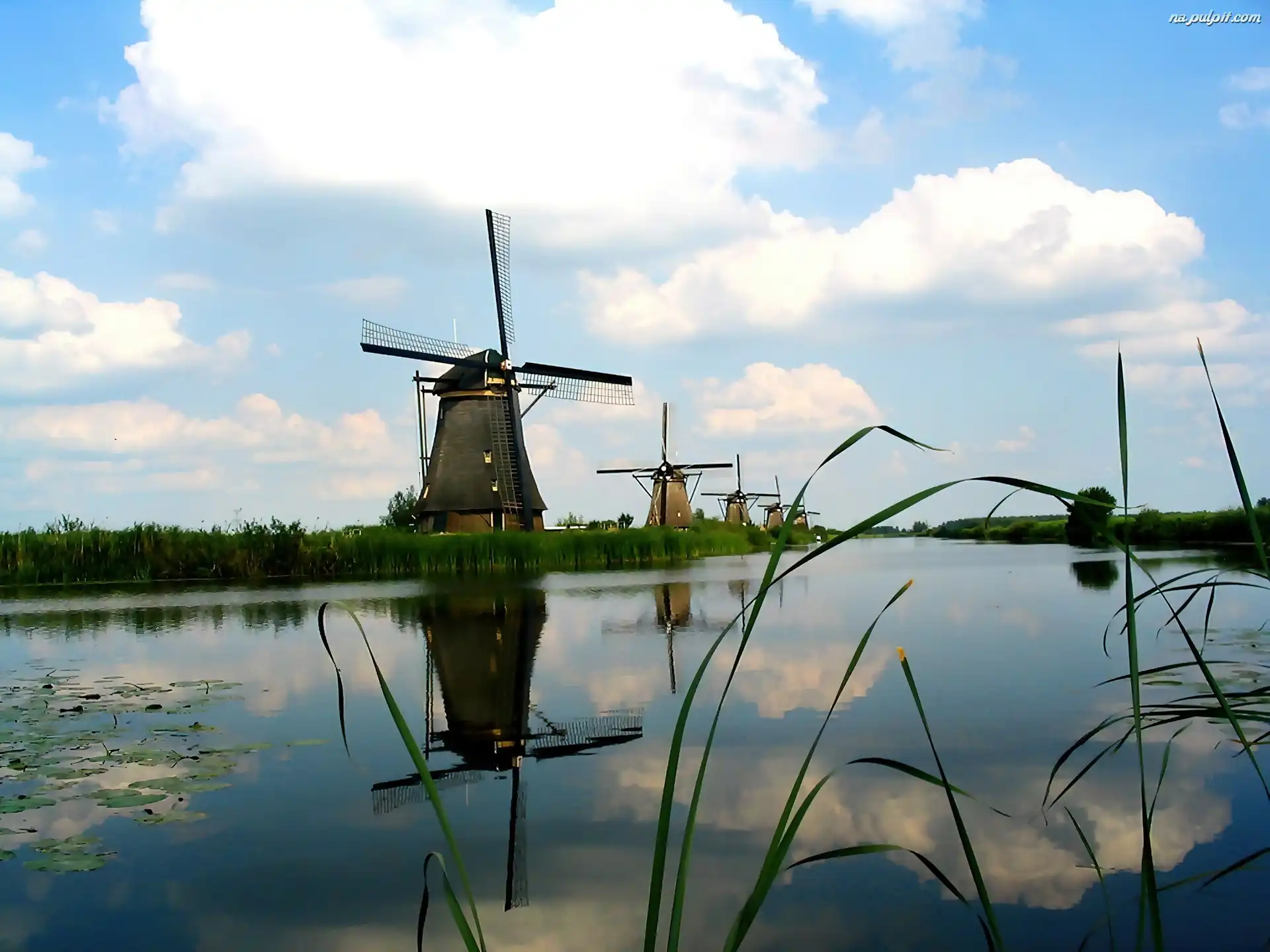 Odbicie, Obłoki, Nad Rzeką, Wiatraki, Rośliny Na Pulpit