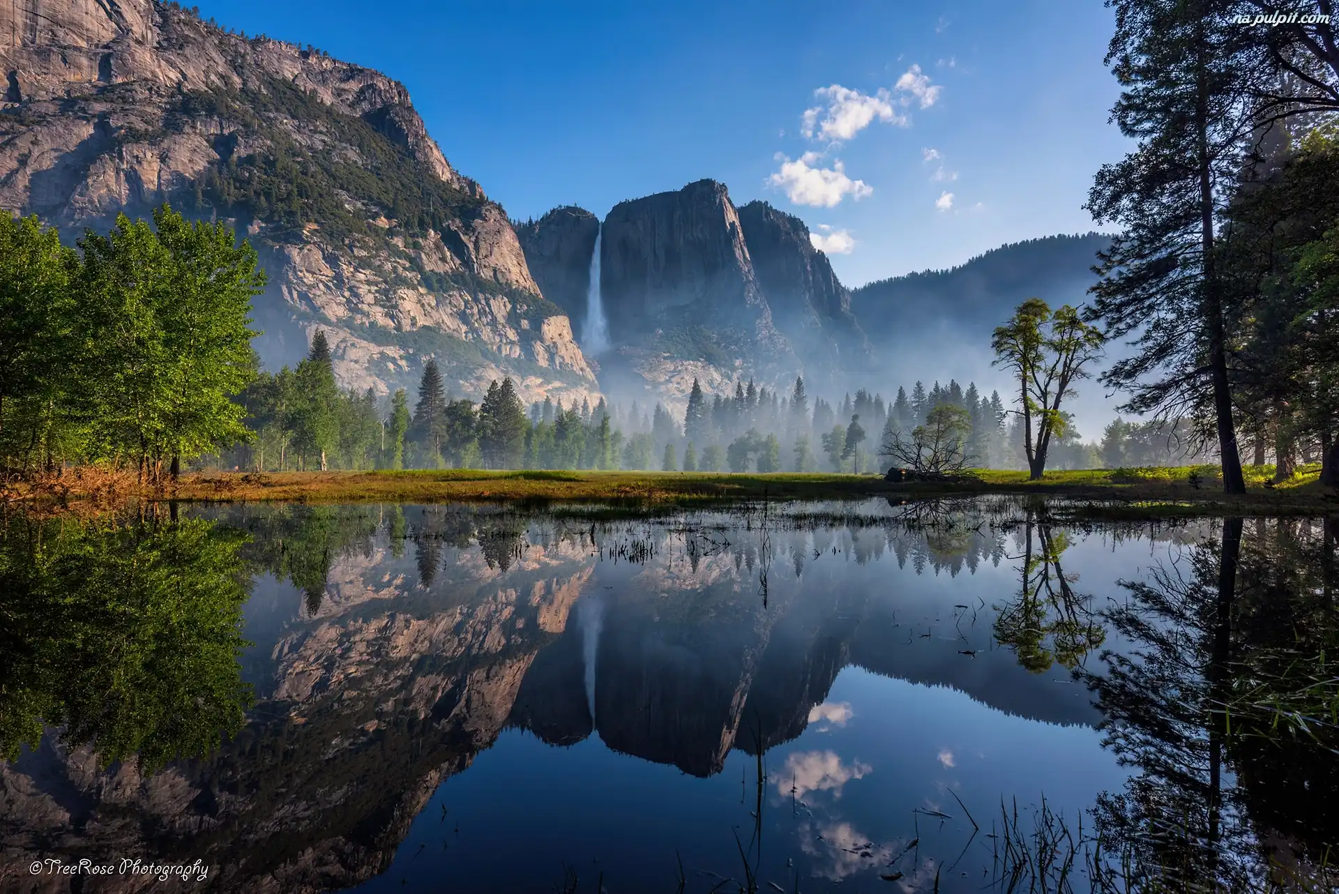 Odbicie, Rzeka, Góry, Stany Zjednoczone, Kalifornia, Park Narodowy Yosemite, Drzewa Na Pulpit
