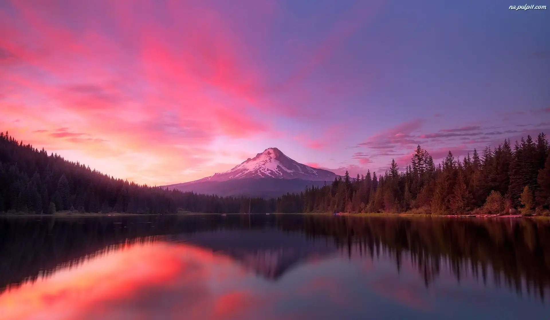 Odbicie, Las, Jezioro, Góry, Zachód słońca Na Pulpit