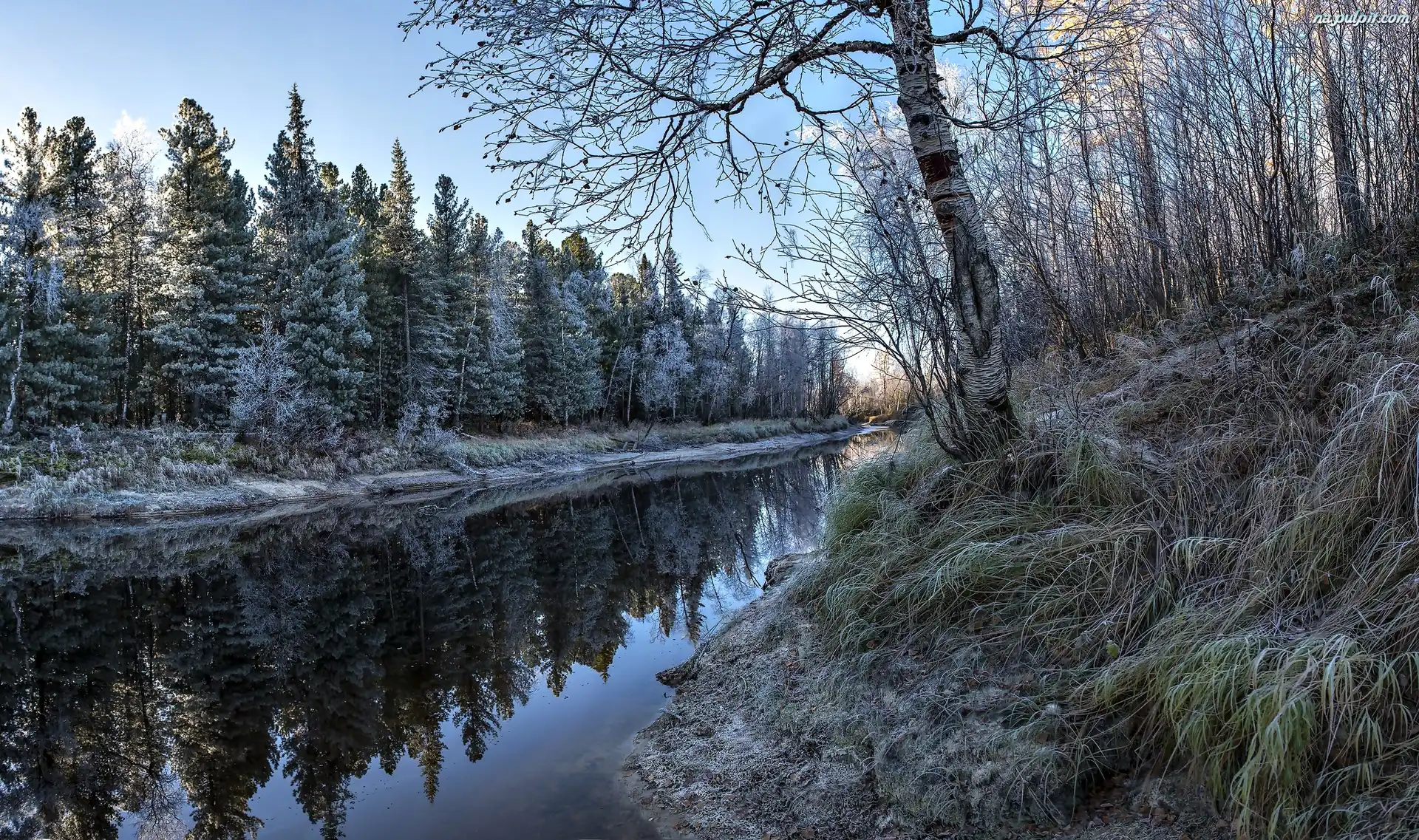 Odbicie, Rzeka, Zima, Drzewa Na Pulpit
