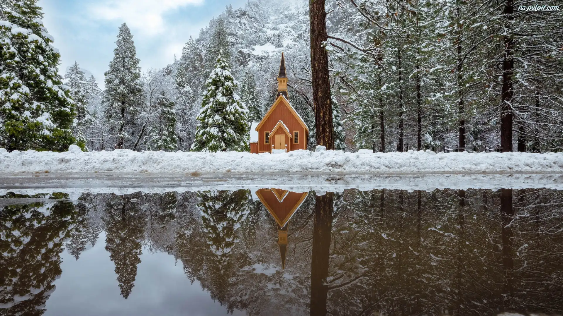 Odbicie, Drzewa, Rzeka, Zima, Kościółek Na Pulpit