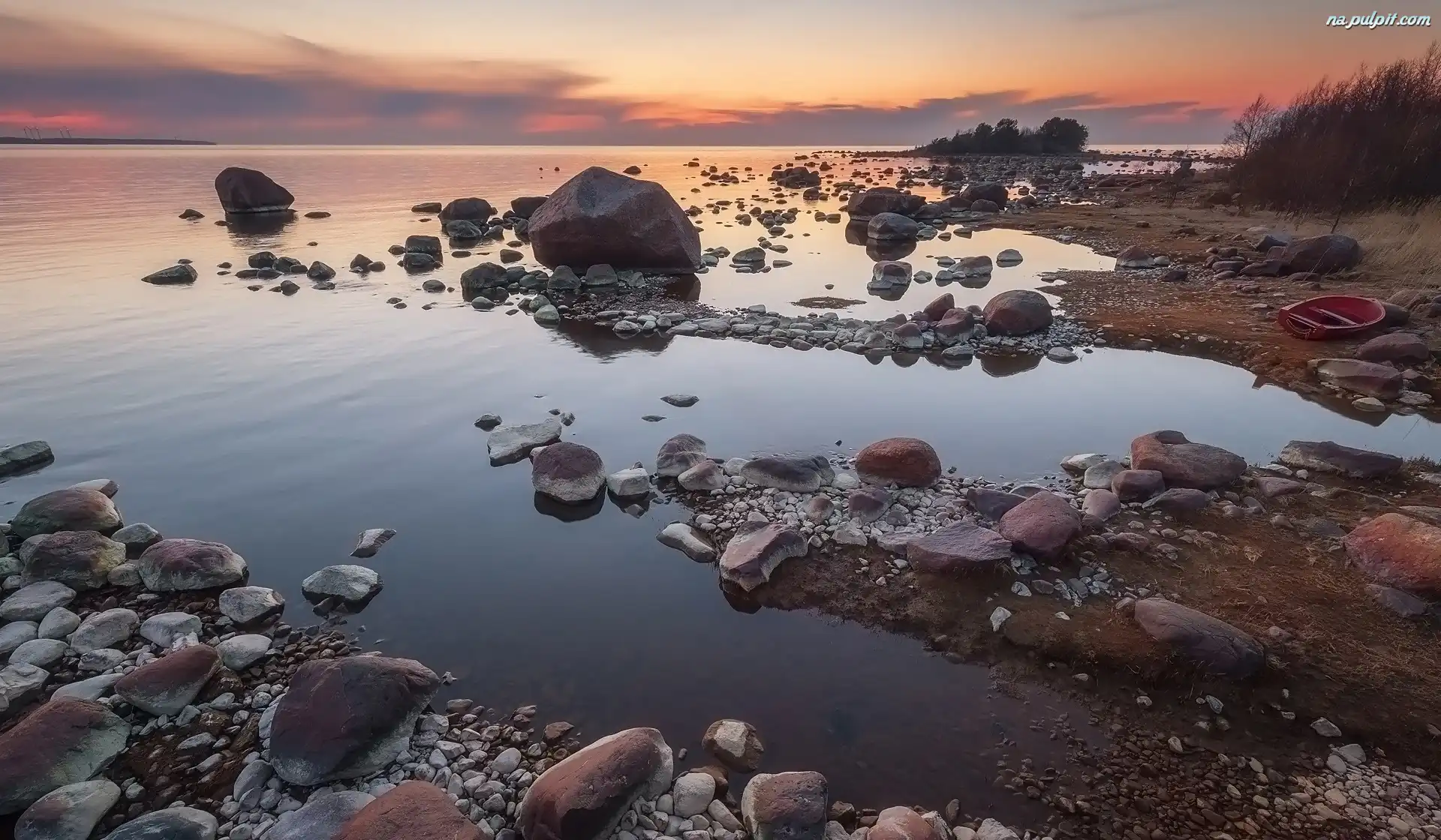 Łódka, Zachód słońca, Brzeg, Morze, Kamienie Na Pulpit