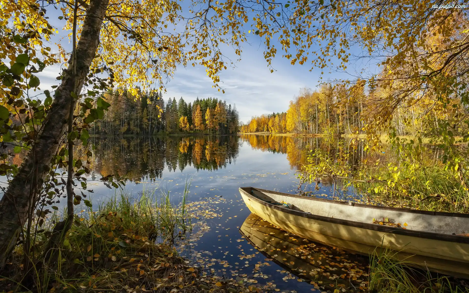 Jesień, Łódka, Drzewa, Słoneczny, Dzień, Brzozy, Jezioro, Las Na Pulpit