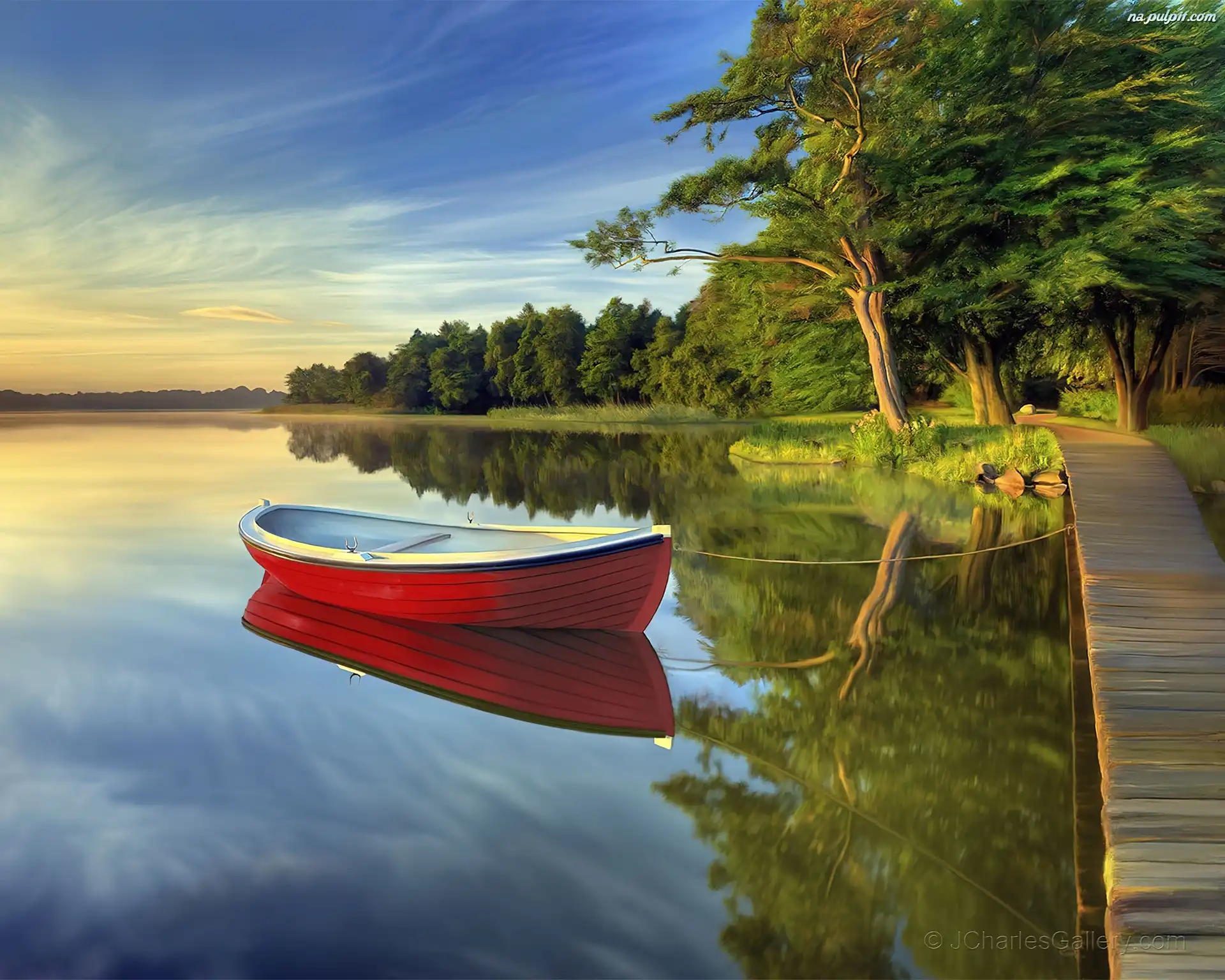 Odbicie, Łódka, Drzewa, Drewniany, Jezioro, Czerwona, Mostek Na Pulpit