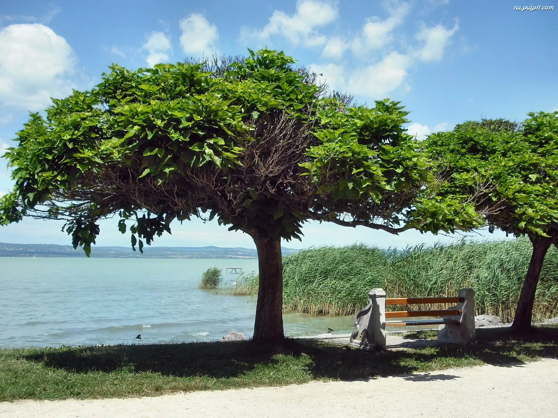 Odpoczynek, Drzewa, Jezioro, Ławka