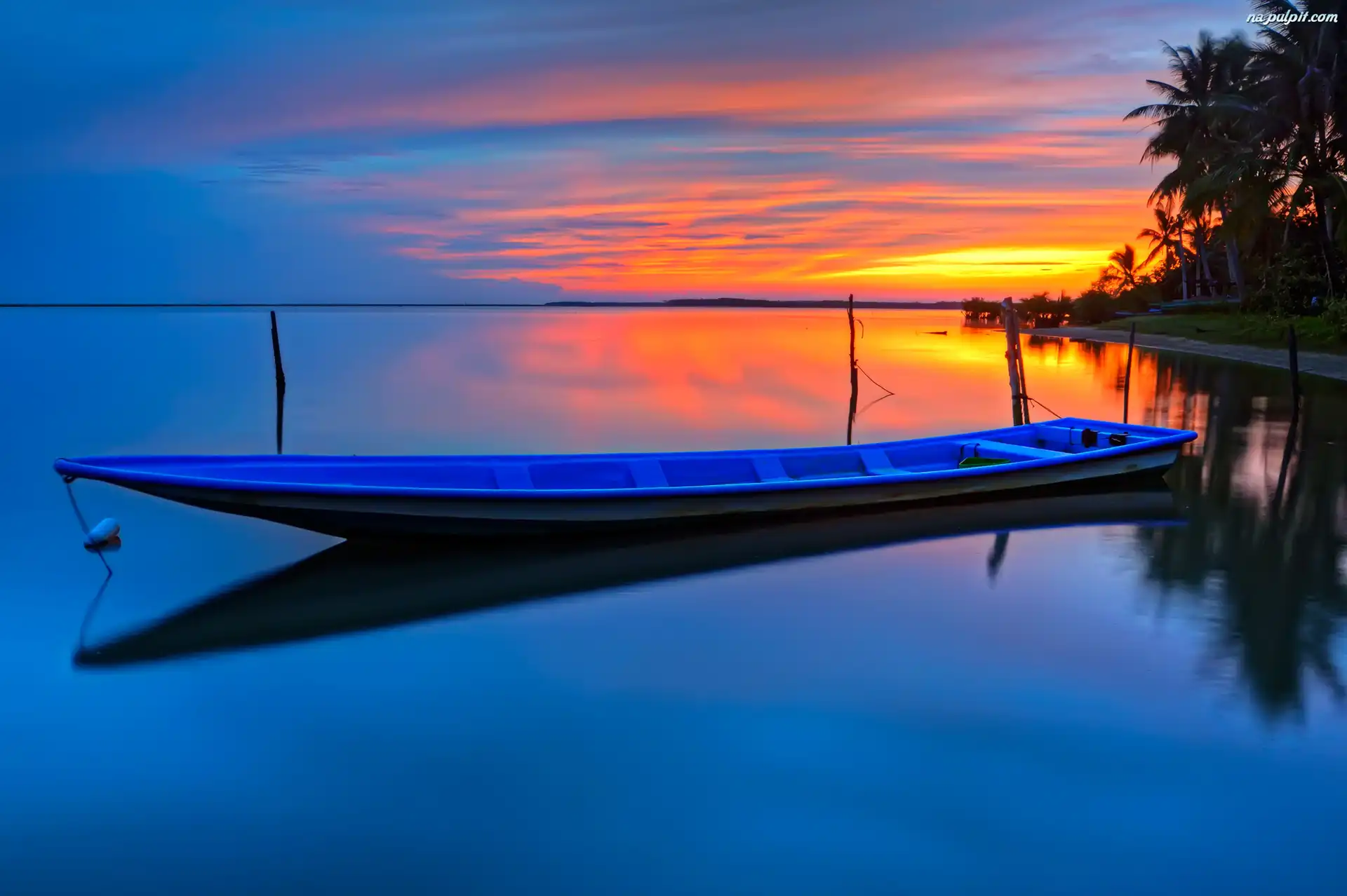 Łódz, Słońca, Tropiki, Palmy, Morze, Zachód