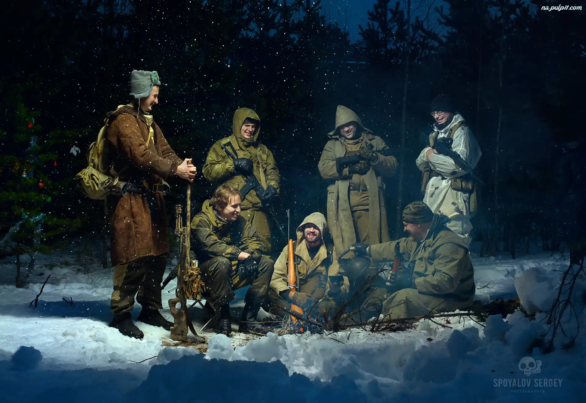 Ognisko, Las, Śnieg, Zima, Żołnierze