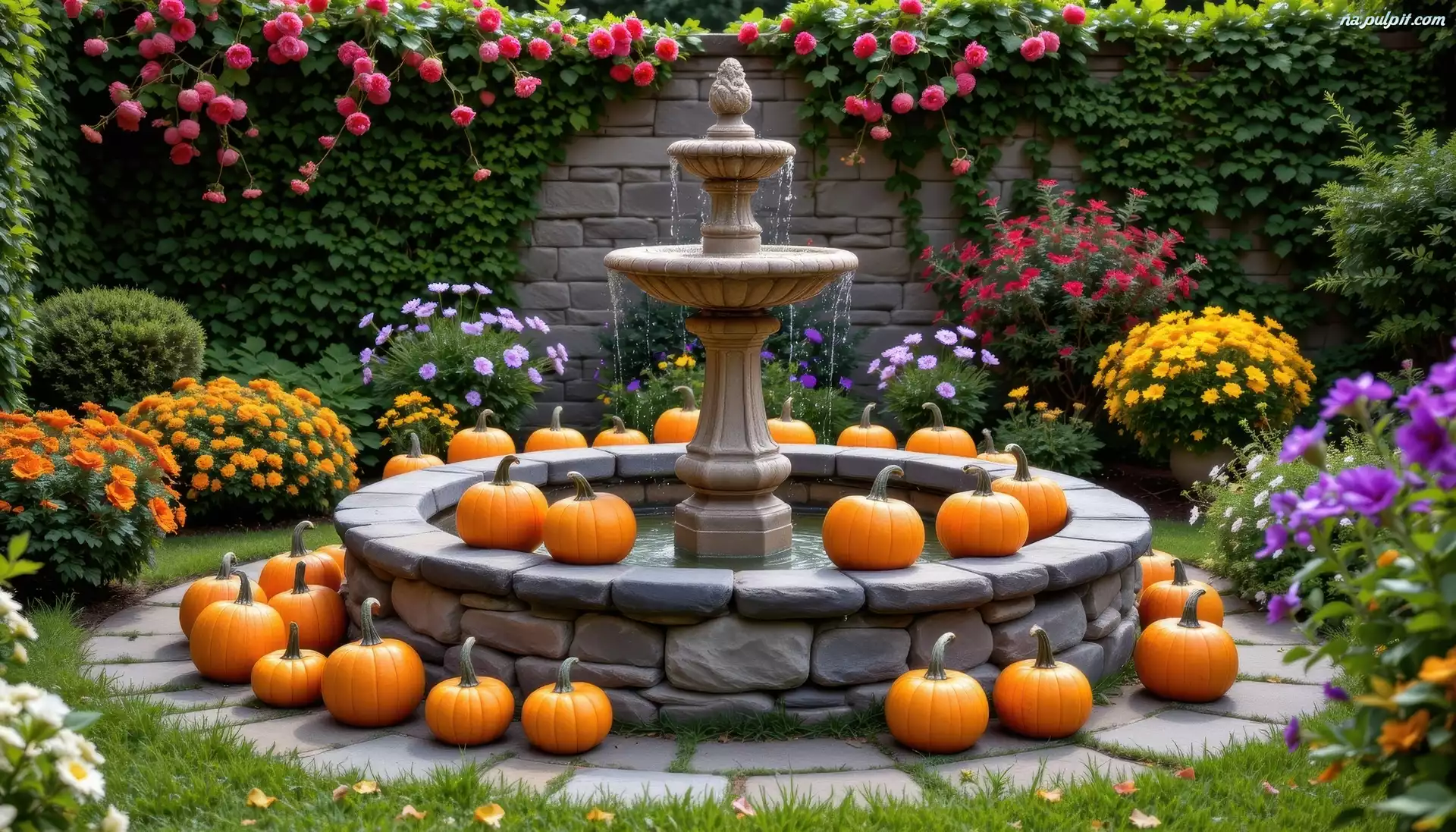 Kwiaty, Ogród, Fontanna, Mur, Dynie