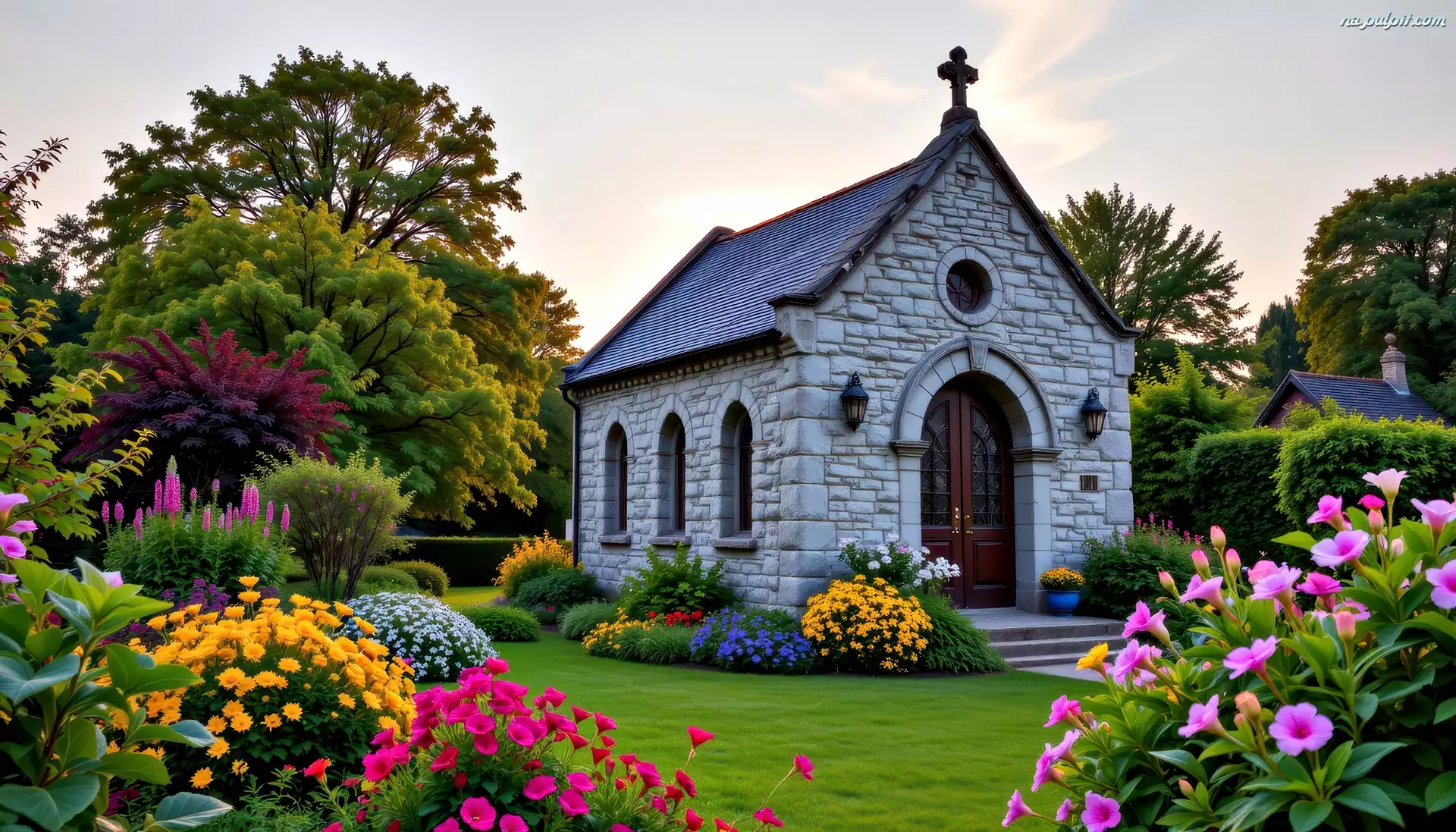 Drzewa, Kaplica, Kwiaty, Ogród, Kościół, Grafika AI Na Pulpit