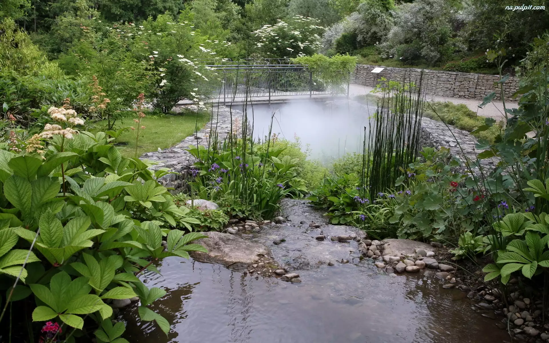 Ogród, Krzewy, Mostek, Kwiaty Na Pulpit