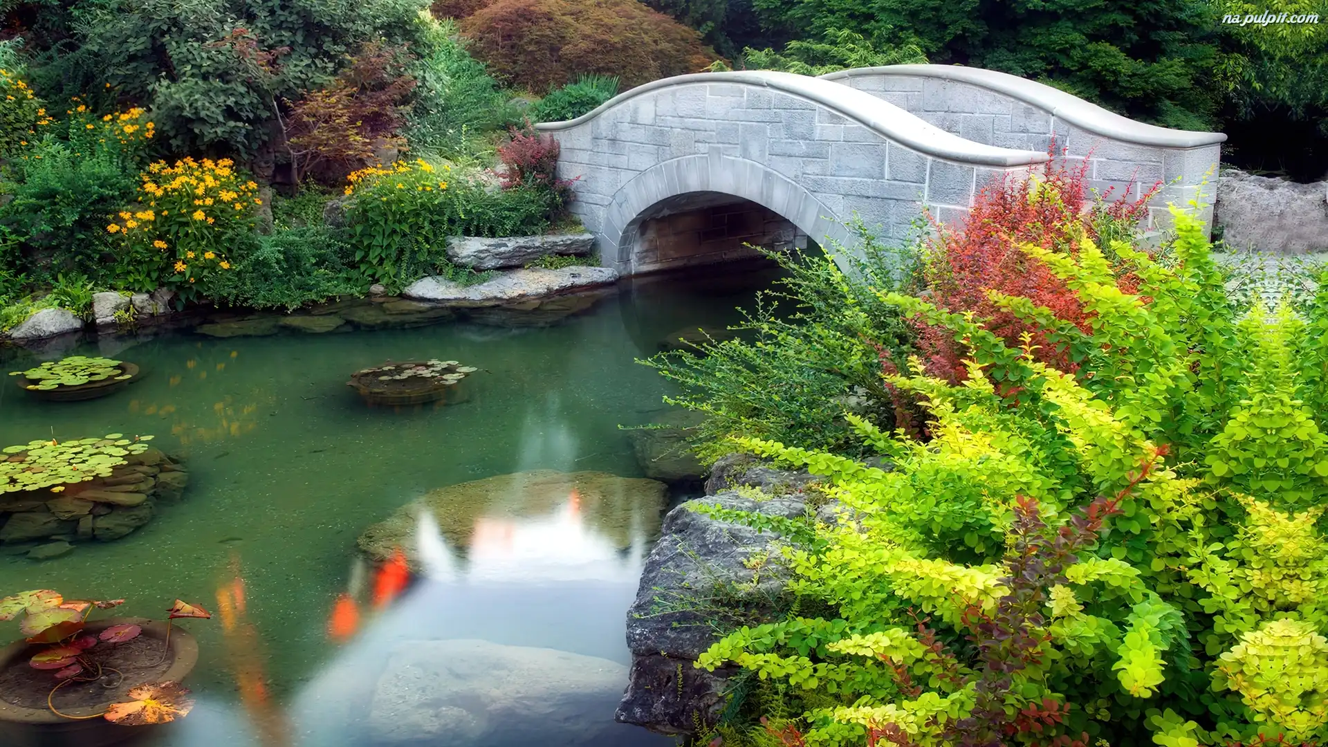 Ogród, Staw, Mostek, Krzewy Na Pulpit